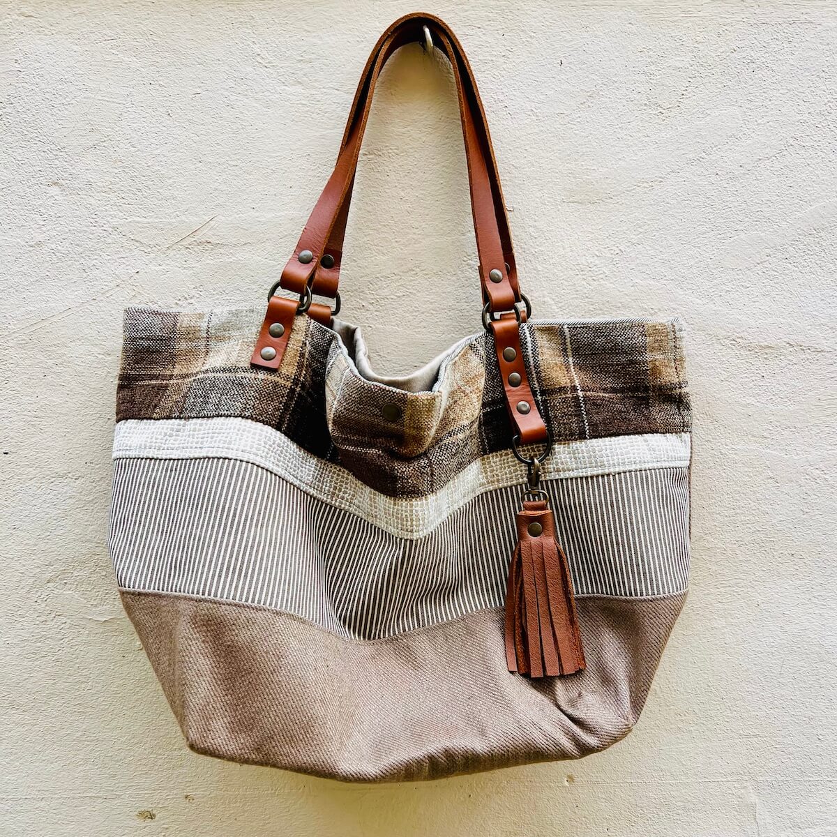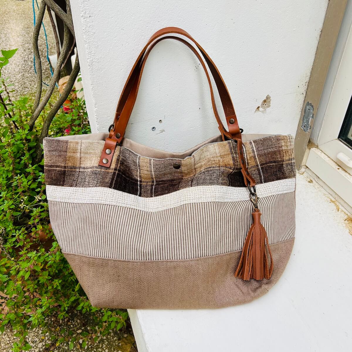Sac cabas femme en patchwork de toile de lin beige, tissu rayé beige, bande métallisé et carreaux velouté. Pompon en cuir brun. Intérieur réversible en tissu coton beige et gris avec une poche. Fermeture par bouton aimantée. Anses en cuir au tannage végétal brun. Porté épaule. Taille M/L.
