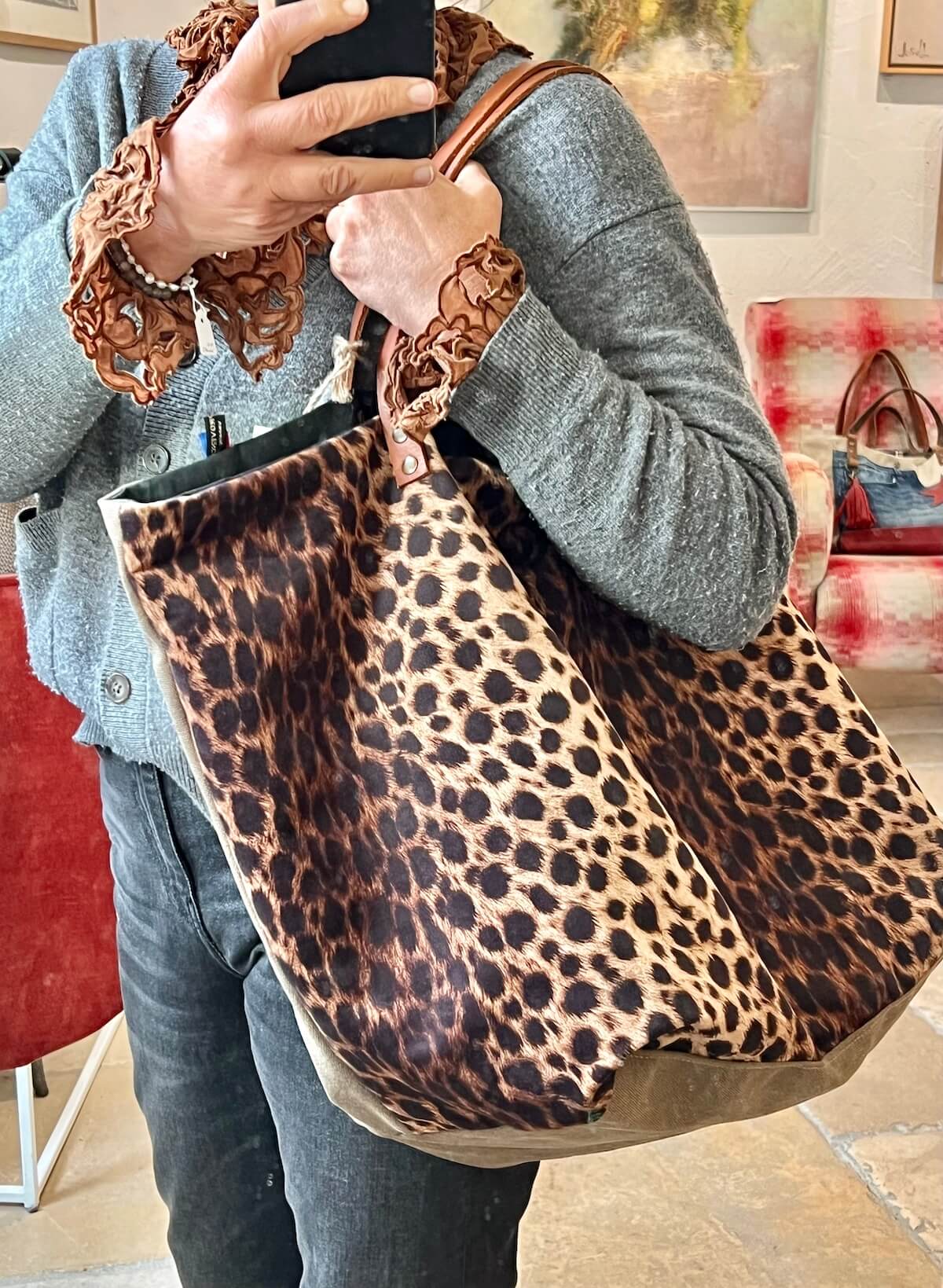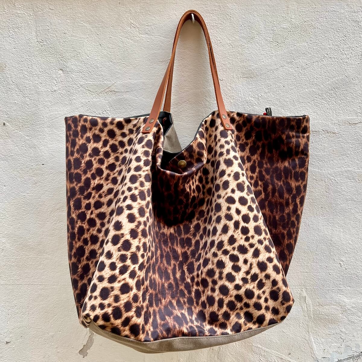 Ce cabas oversize conjugue audace et fonctionnalité. Son tissu léopard réversible façon peau et face bis en toile de coton beige, les anses en cuir permettent un porté épaule confortable, l’intérieur réversible en toile noire enduite, doté de grandes poches, accueille vos essentiels avec une organisation parfaite. Un sac unique compagnon pensé pour la vie urbaine comme pour l’évasion…