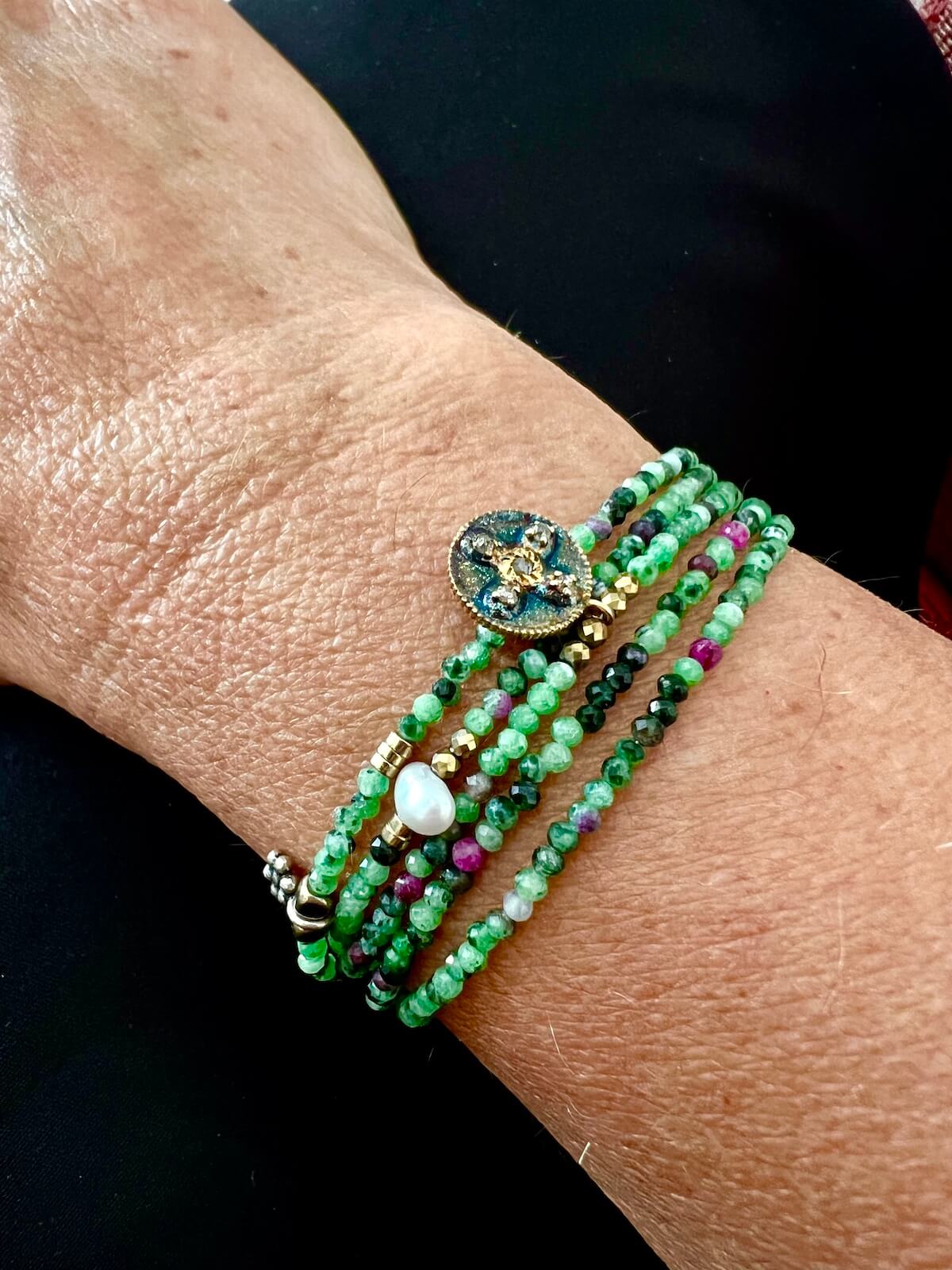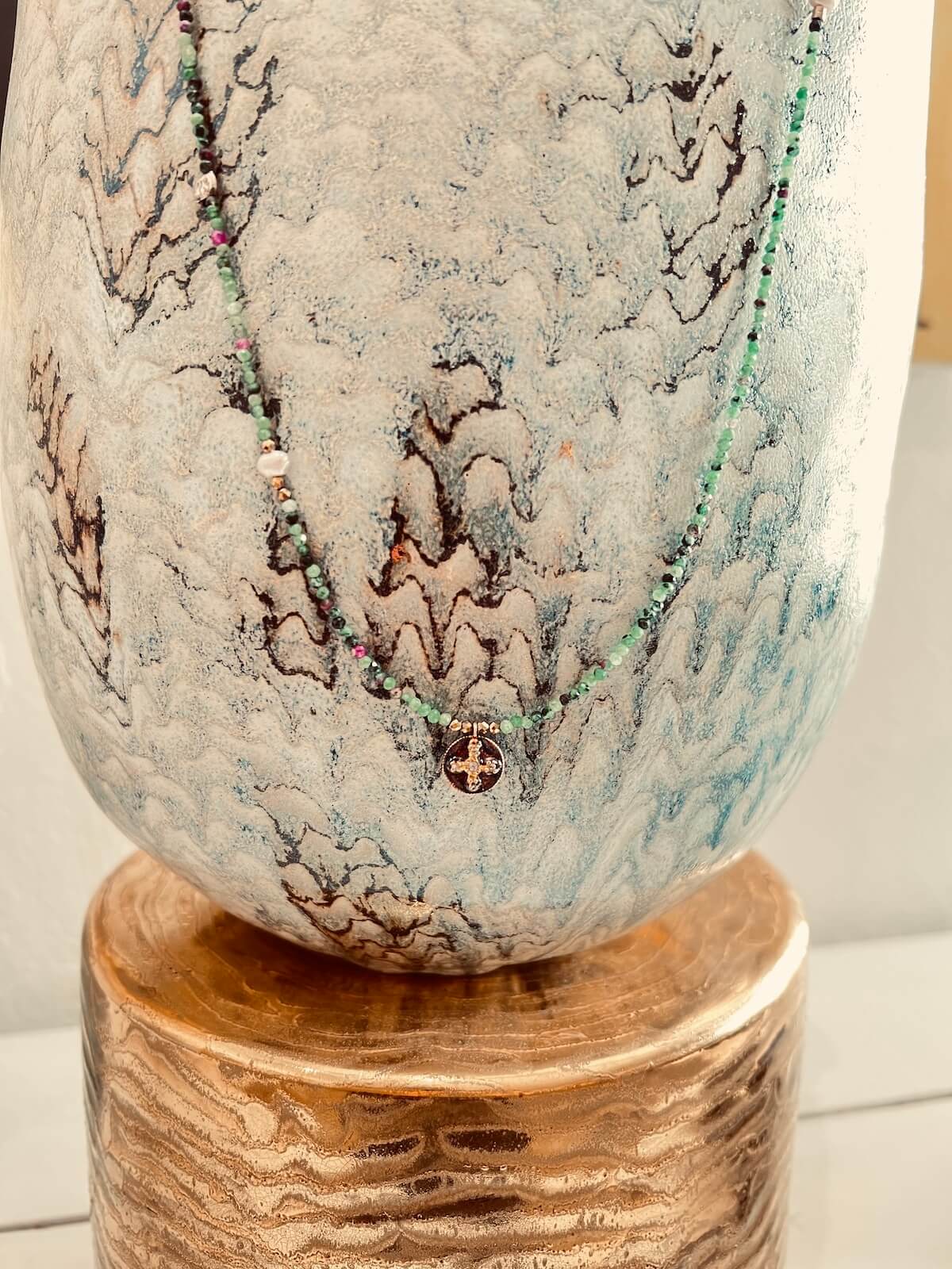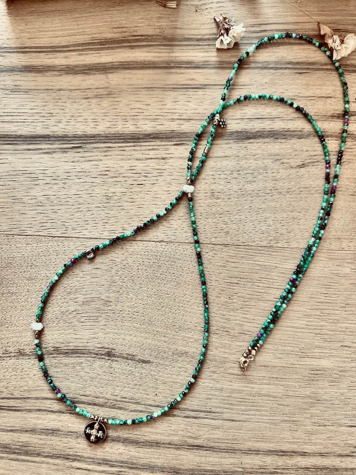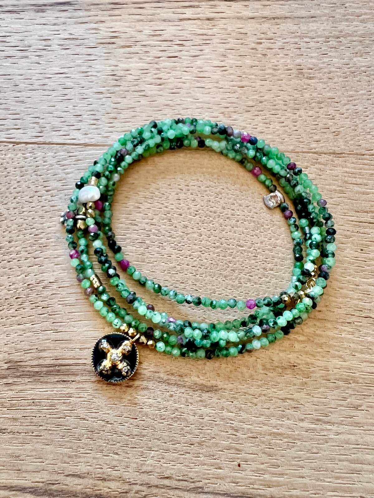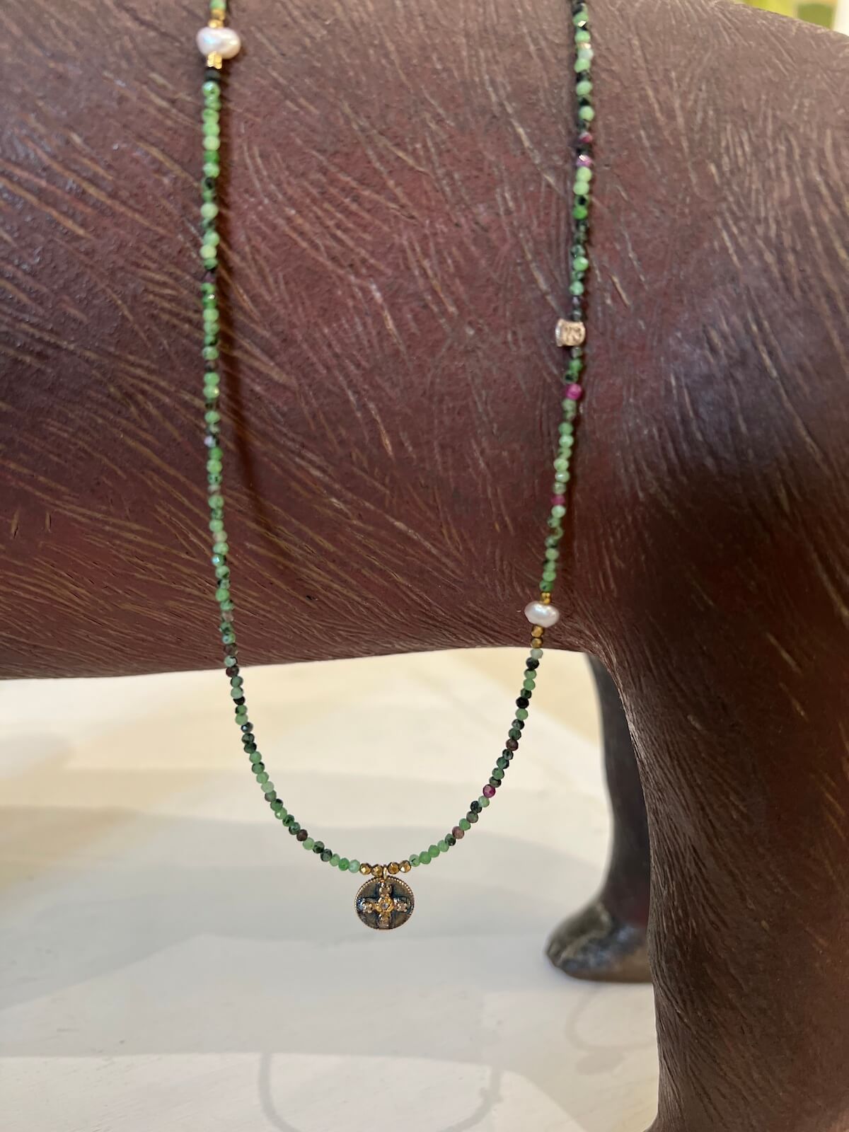 MATIÈRE : perles de rubis zoïsite facetté 2mm, pendentif argent 925 plaqué or avec diamants bruts, breloques en argent, perle d’eau douce,…