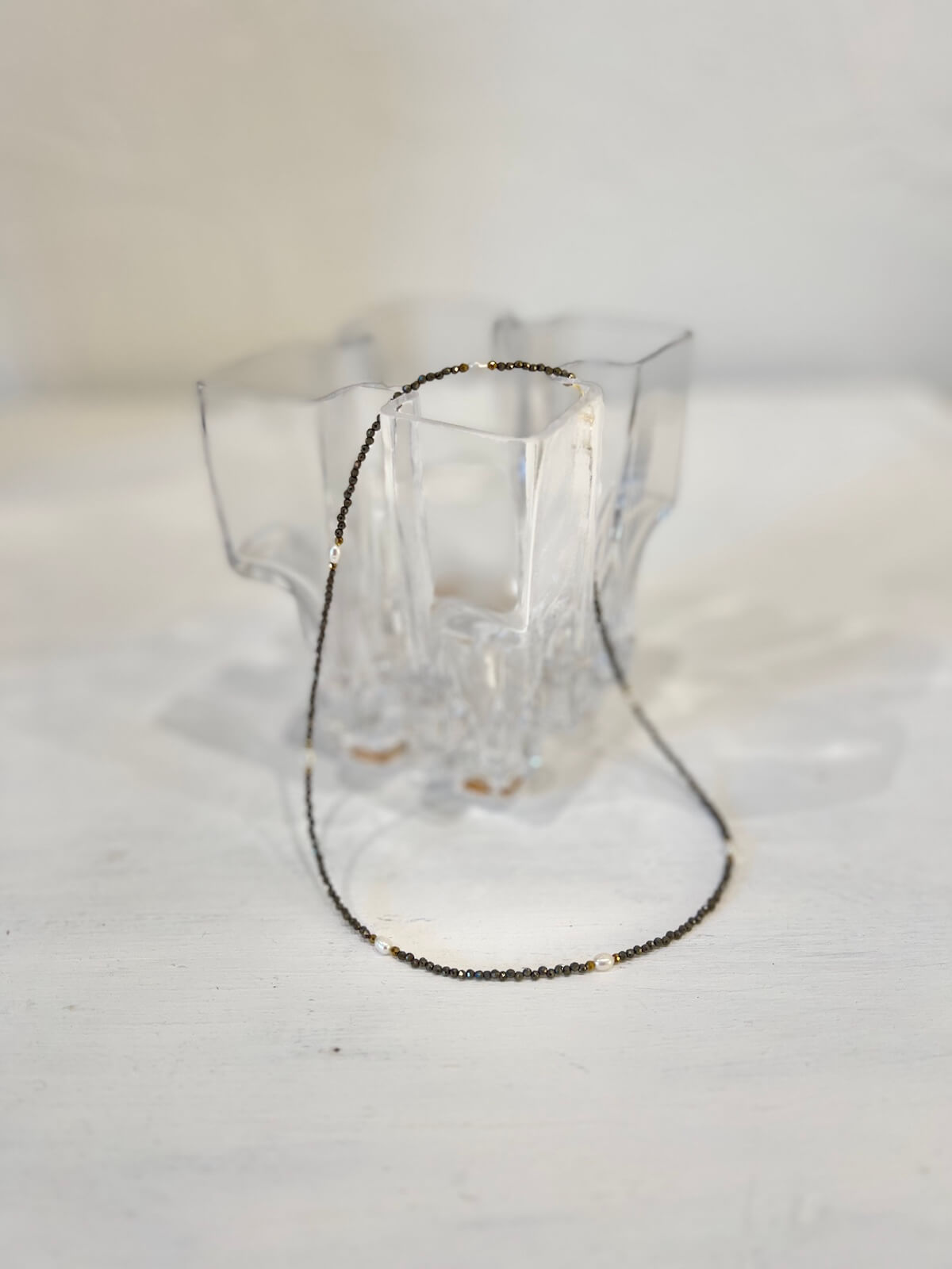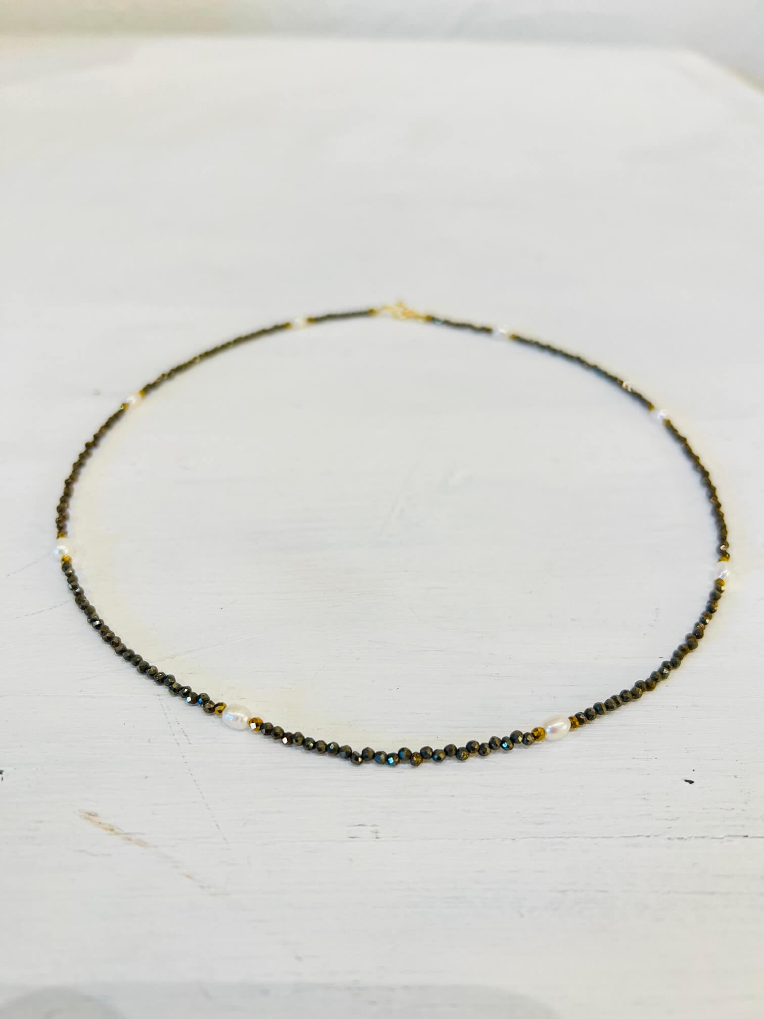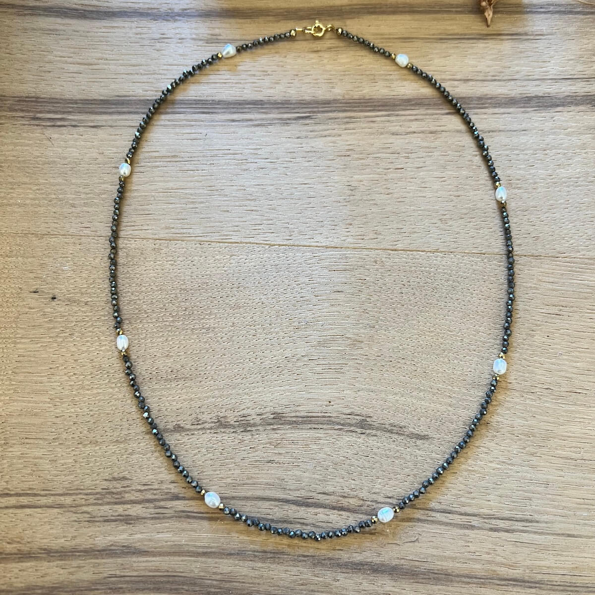 Collier en micro perles facettée de pierre fine, en pyrite et perles d’eau douce, de longueur moyen.