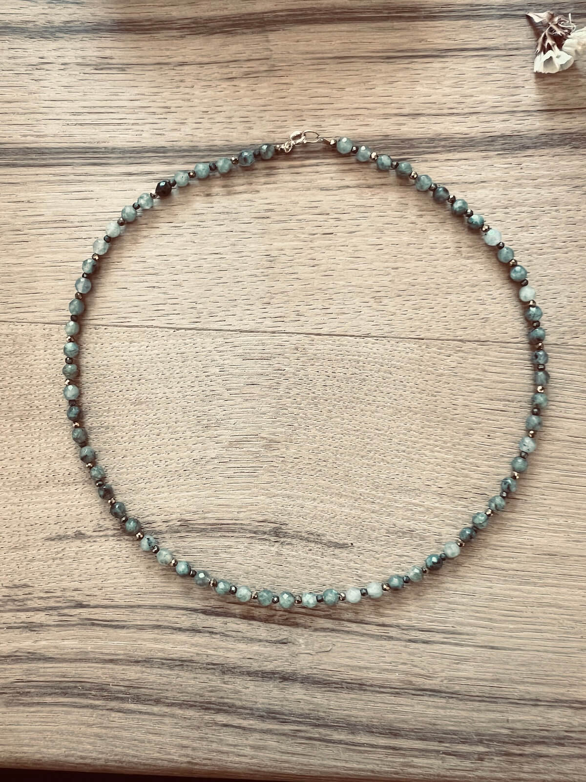Collier en perles facettée de labradorite et micro perles facettés d’hématite doré et de pyrite, de longueur courte.