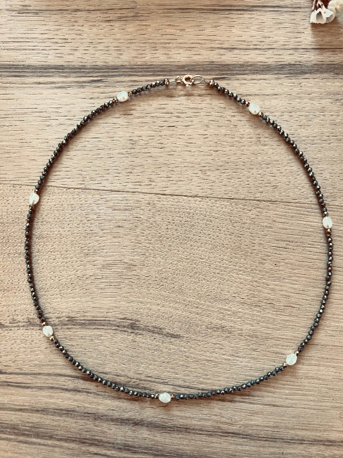 Collier en micro perles facettée de pierre fine, en pyrite et perles d’eau douce, de longueur courte.