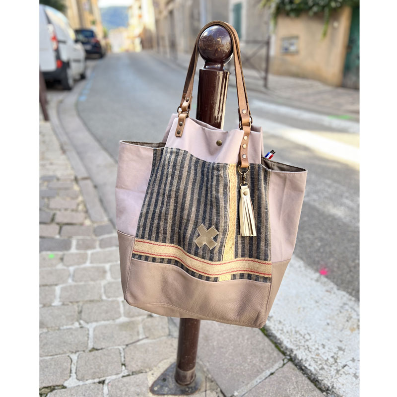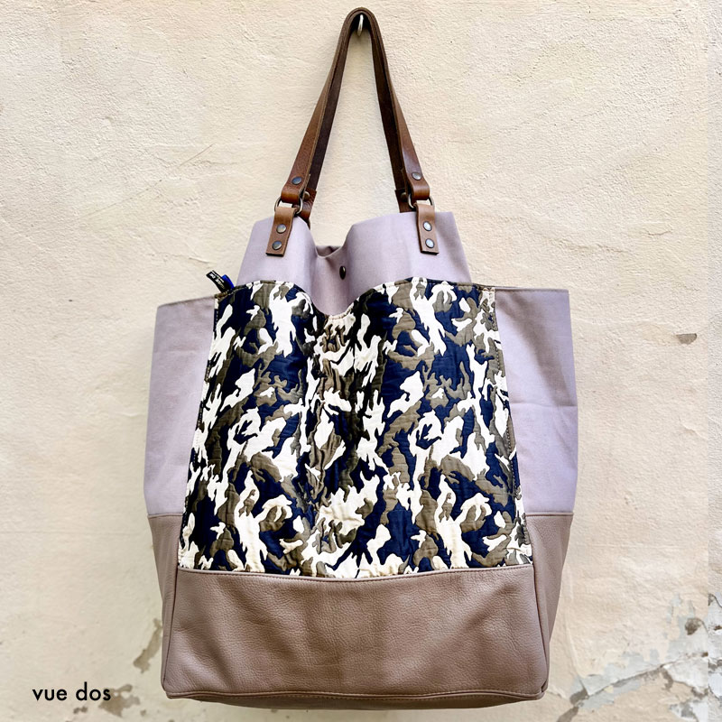 Grand sac cabas xxl porté épaule. En composition de cuir vachette beige taupe et toiles de coton, lin et camouflage matelassé.Sac unique et original pour homme ou femme. Anses en cuir au tannage végétal. Intérieur réversible en toiles de coton et lin avec une grande poche zippée pour tout ranger en sécurité. Sac bohème chic pour se balader en ville, pour partir en weekend ou pour la plage en version chic.