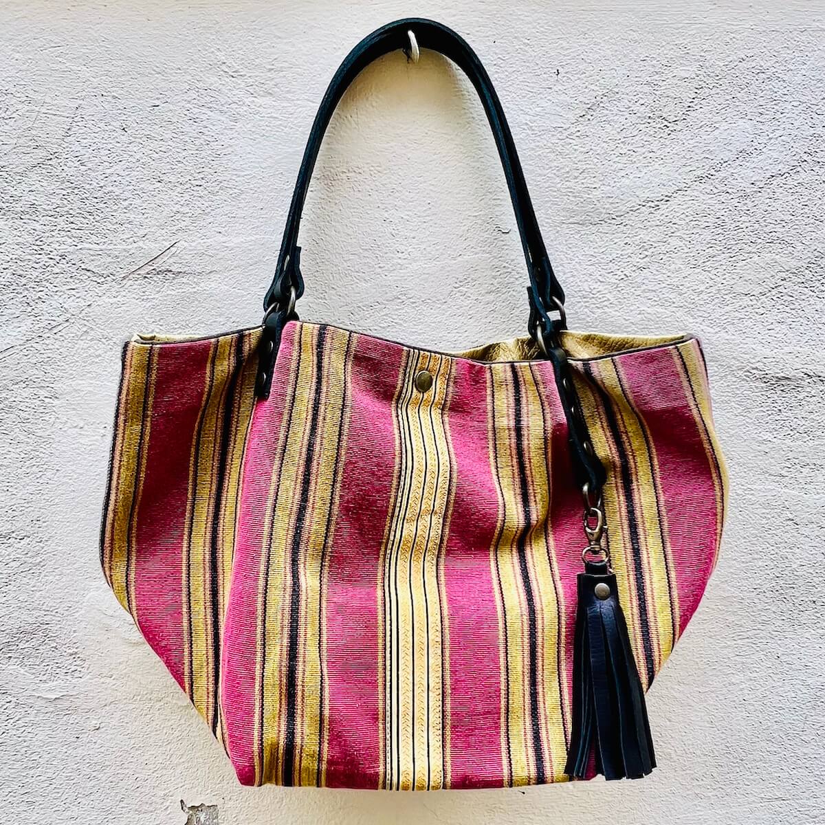 Sac cabas en toile de lin ancien recyclé et galon doré associé à un pompon en cuir noir. Rouge, doré et noir. Intérieur en tissu beige et doré façon cuir avec une poche. Fermeture par bouton aimantée. Anses en cuir au tannage végétal noir. Porté épaule. Taille S/M.