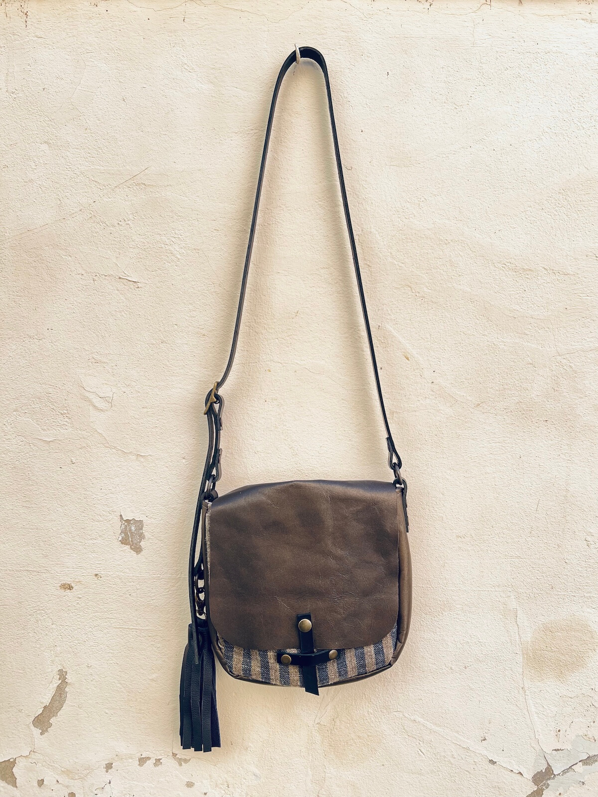 EXTERIEUR du sac besace – en bi matière, cuir brun nacré et toile de lin huilé aux rayures noir et brun-taupe – multipoche avec poche arrière & poche devant (cuir contre le corps pour la solidité) / rabat en cuir brun nacré, avec pompon amovible en cuir noir