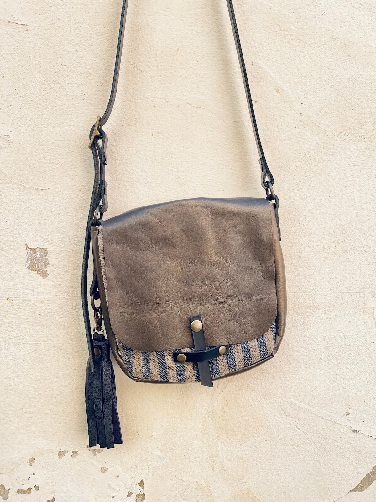 Ce sac bandoulière en pièce unique de la collection de sacs bandoulière femme est un petit sac cabanes bi-matière réalisé en cuir brun nacré et en toile de lin huilé. La matière eco responsable de ce sac besace cuir est issue de matières en fin de série de belle qualité. Le tissu en toile de lin est rayé noir et blrun-taupe. La finition soigné de ce sac bandoulière haut de gamme donne une allure chic et décontractée à votre look du jour. Ce sac multipoche permet tout ranger. Un sac bandoulière made in France et confectionné à la main dans notre atelier de sud de la France. Le petit plus, chaque sac besace est fabriqué en pièce unique.