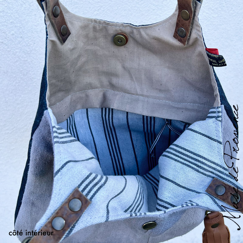 INTERIEUR – et côté réversible en tissu ancien gris rayé avec 1 grande poche zippée