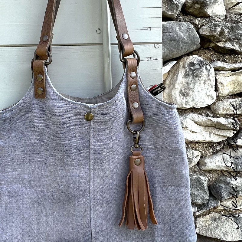 Sac à main chanvre, sac made in France en toile gris. Petit sac totebag léger et robuste.  Anses en cuir porté épaule ou à la main. Avec pompon en cuir. Intérieur doublé en toile rayé avec une grande poche fermé par zip. Sac en pièce unique. Taille S/M.
