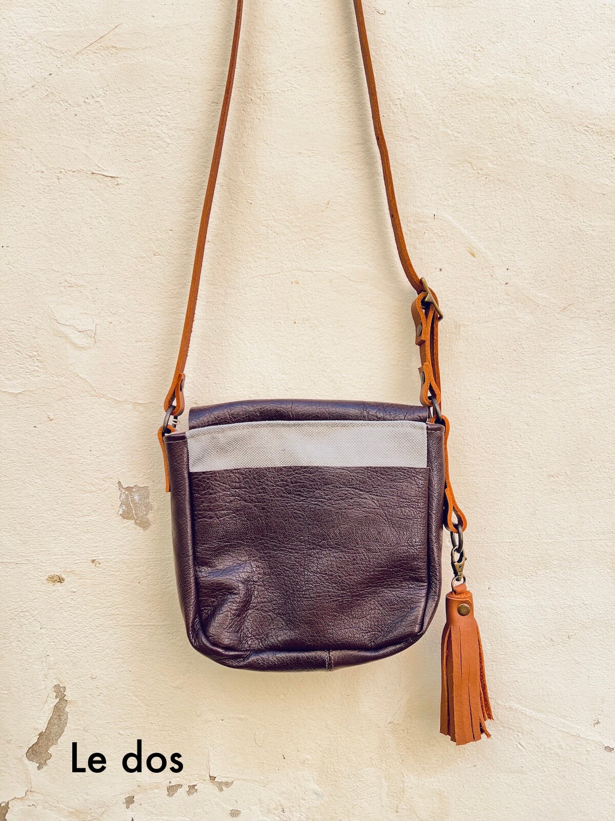 EXTERIEUR du sac besace – en bi matière, cuir brun et toile de lin gris, multipoche, avec poche arrière & poche devant (cuir contre le corps pour la solidité) / rabat en cuir brun avec un pompon amovible en cuir brun