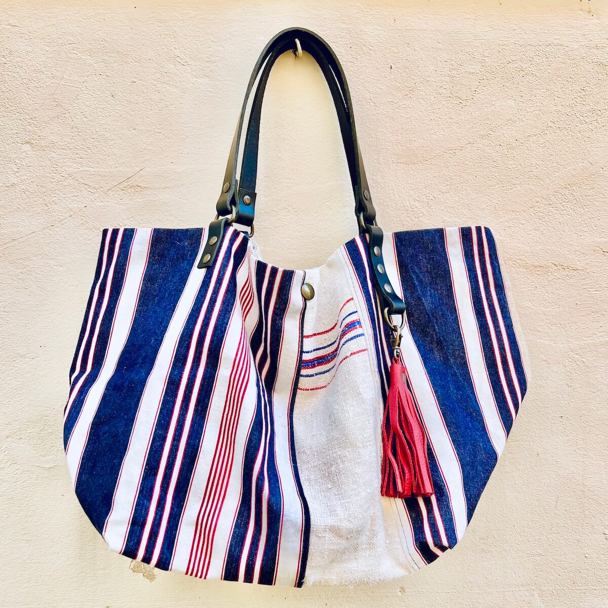 Sac cabas original en toile de coton ancien blanc aux rayures bleu et rouge. Le dos en toile de chanvre beige. Pompon en cuir rouge. Anses en cuir au tannage végétal noir. Intérieur réversible en toile gris argenté avec une poche. Fermeture par bouton aimantée. Porté épaule ou à la main. Taille M/L.