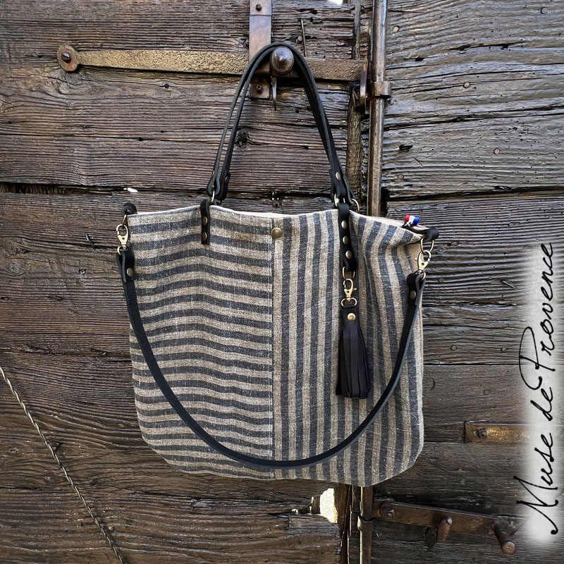 Sac cabas bandoulière lin huilé. Motif à rayure. Il est de format mince et se porte en bandoulière ou à l’épaule. Intérieur (réversible) en coton beige avec une grande poche fermé par zip. Anse et anse bandoulière amovible en cuir noir haut de gamme. Avec pompon en cuir noir. Taille S/M.