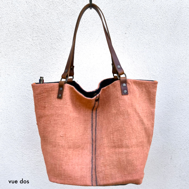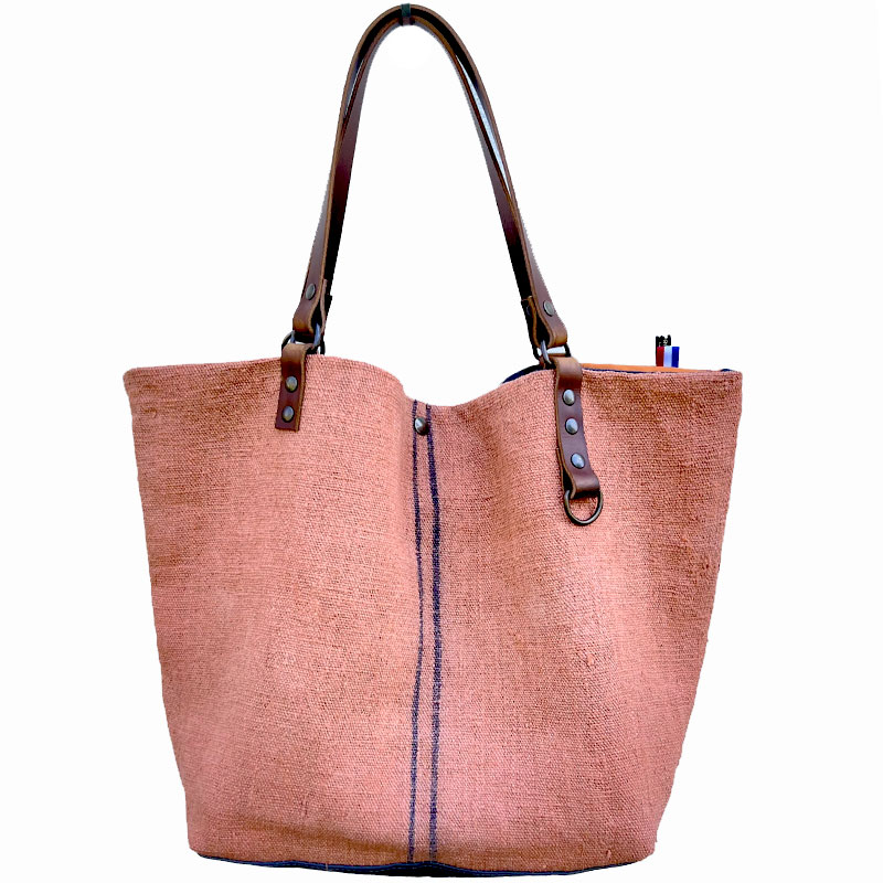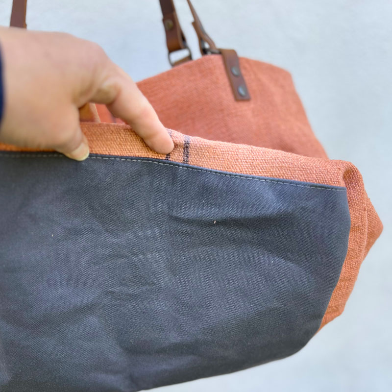 EXTERIEUR du sac cabas réversible – en toile de chanvre ancienne teinté en orange brulée au rayure bleu beige avec le fond semi rigide en toile de coton gris athracite