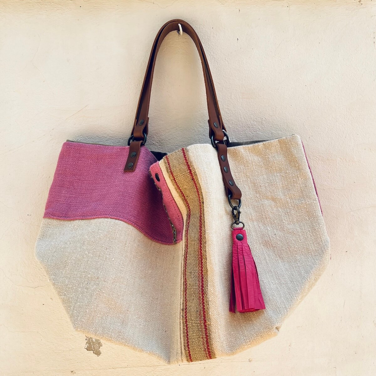 Cabas réversible en superbe chanvre chevronné vintage associé au lin rose..