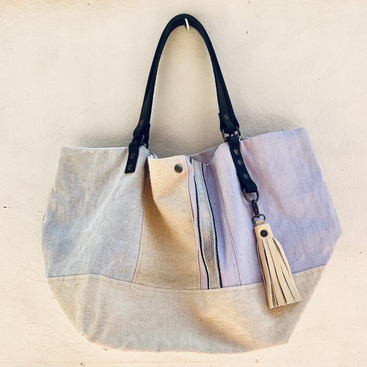 Sac cabas réversible en patchwork de lin et chanvre ancien recyclé. Ce sac cabas vintage est une pièce unique de créateur fabriqué à la main en Provence. La composition de tissus haut de gamme en chanvre beige, en coton parme et le galon ancien au fil d’or de soieries lyonnaises rendent ce sac cabas unique et original. L’allure chic de ce sac cabas élégant vous plaira surement !