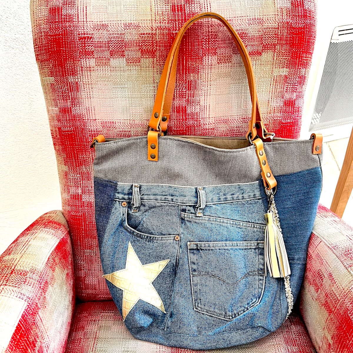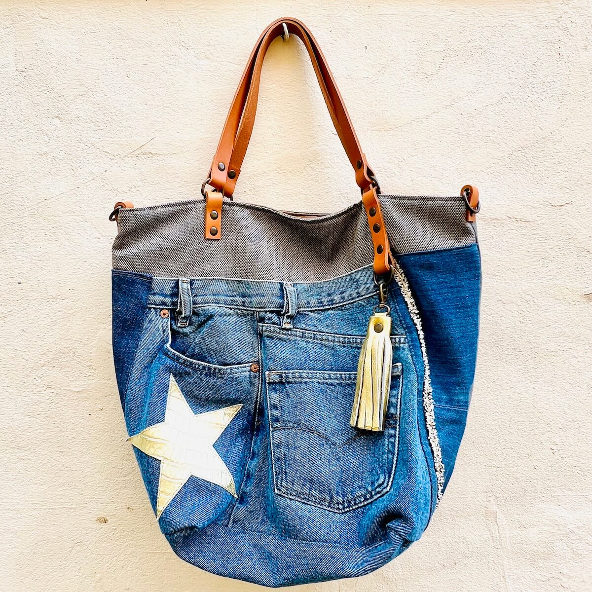 EXTERIEUR du sac cabas jean – en mix et match de jean recyclé (Diesel) avec détail toile gris chiné noir avec étoile en cuir doré et avec deux poches / le dos en toile de coton lavé gris