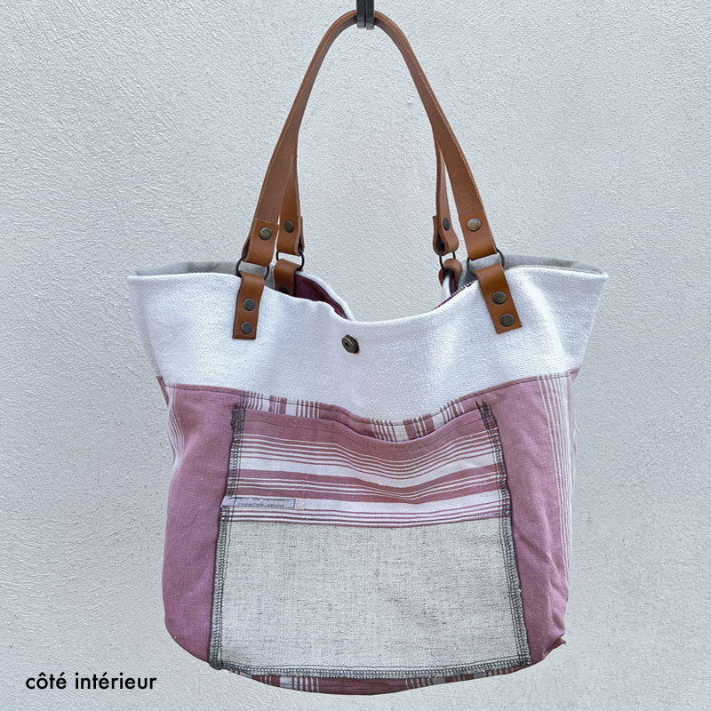 Sac cabas lin en toiles anciennes recyclés. Lin naturel, cuir rouge, tissu brodé rose et tissu argenté caractérisent ce sac cabas made in France. Intérieur et côté réversible en toile rayé rose avec 1 grande poche. Anses en cuir tannage végétal et pompon assorti. Taille M/L.