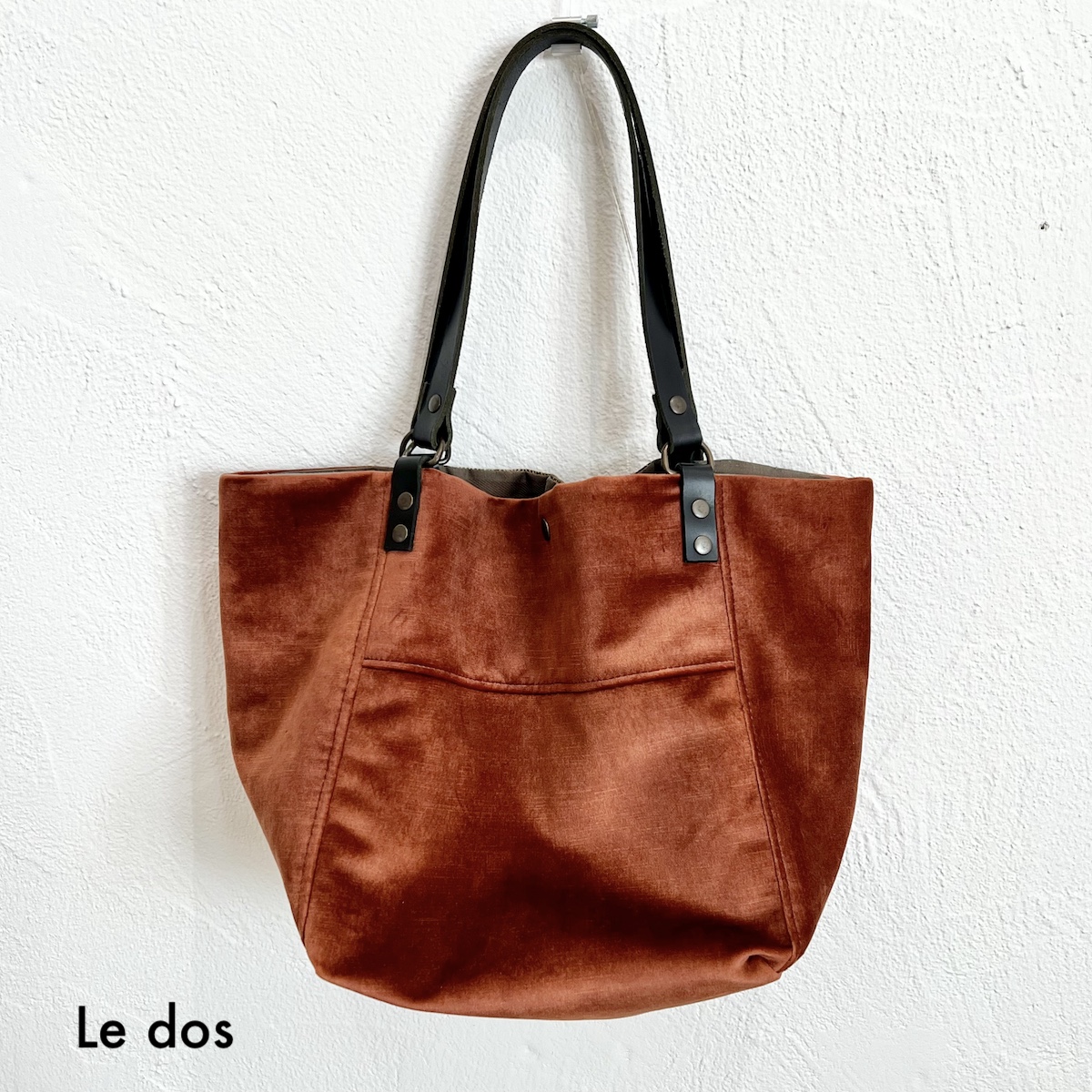 Sac cabas réversible conçu à partir de velours lisse d’ameublement couleur cuivre. L’intérieur réversible en toiles beige et taupe. Le sac à main unique dispose d’une grande poche intérieure, pratique pour vos petits objets essentiels. Sa légèreté fait de ce sac minimaliste le compagnon idéal du quotidien. Ce sac cabas peut se porter à l’épaule ou à la main.