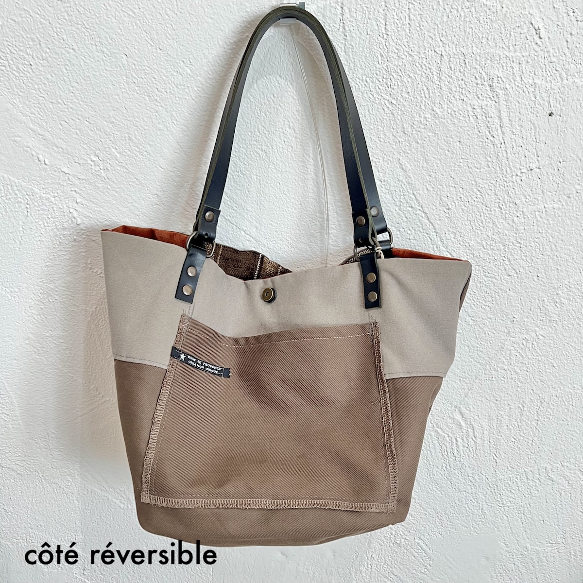 INTERIEUR et côté réversible : en toiles de coton beige et taupe avec 1 poche