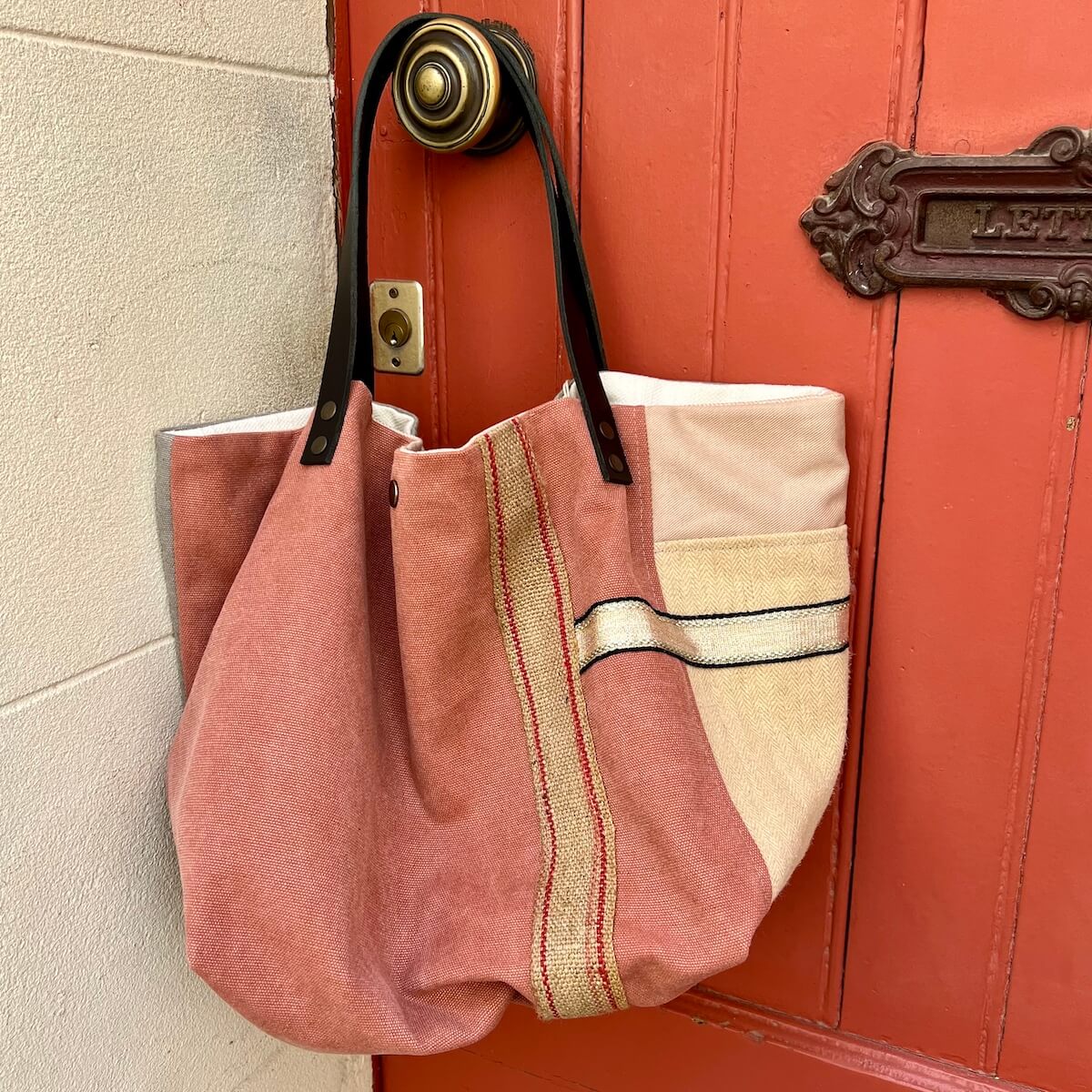 Sac cabas réversible en patchwork rose-orange ocre et chanvre avec un galon en jute et galon doré de soieries lyonnaises