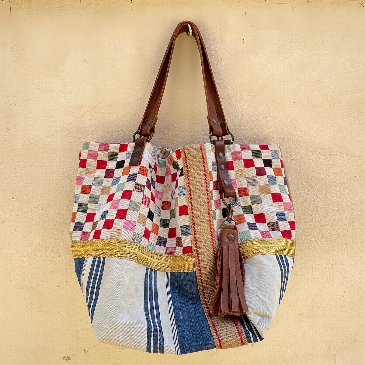 EXTERIEUR du sac cabas réversible – en mix et match de tissu arlequin multicolore et toile ancien rayé bleu et blanc avec galon ancien doré et en jute et pompon en cuir brun / le dos en toile de coton beige