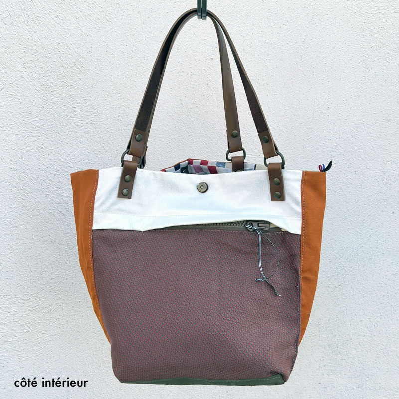 INTERIEUR – et côté réversible composé en toiles terracotta, vert et gris antrachite avec 1 grande poche fermé par fermeture glissière et le fond semi-rigide