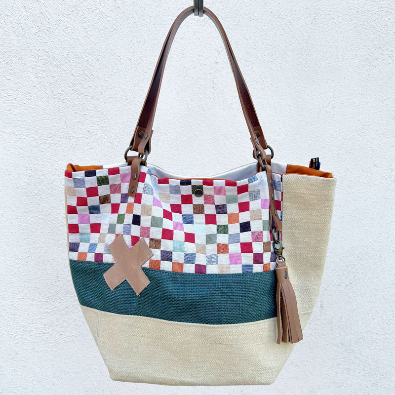 Succomber pour ce sac cabas unique et original, façonné à partir d’un chanvre naturel beige sélectionné pour sa beauté authentique. Sa teinte beige naturel met en valeur la matière subtile associé aux éléments de composition, tissu échiquier multicolore et lin vert sapin – croix et pompon en cuir beige pour parfaire l’ensemble.