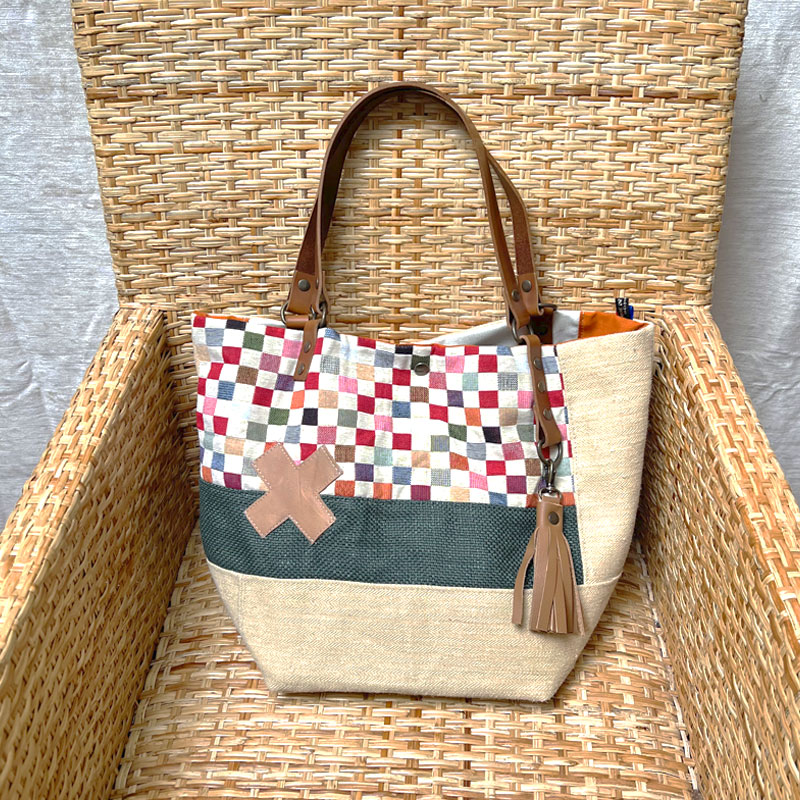 EXTERIEUR – en chanvre tissage chevrons beige naturel (toile d’ameublement), toile à l’échiquier multicolore et détail en lin vert sapin associé au croix et pompon en cuir beige
