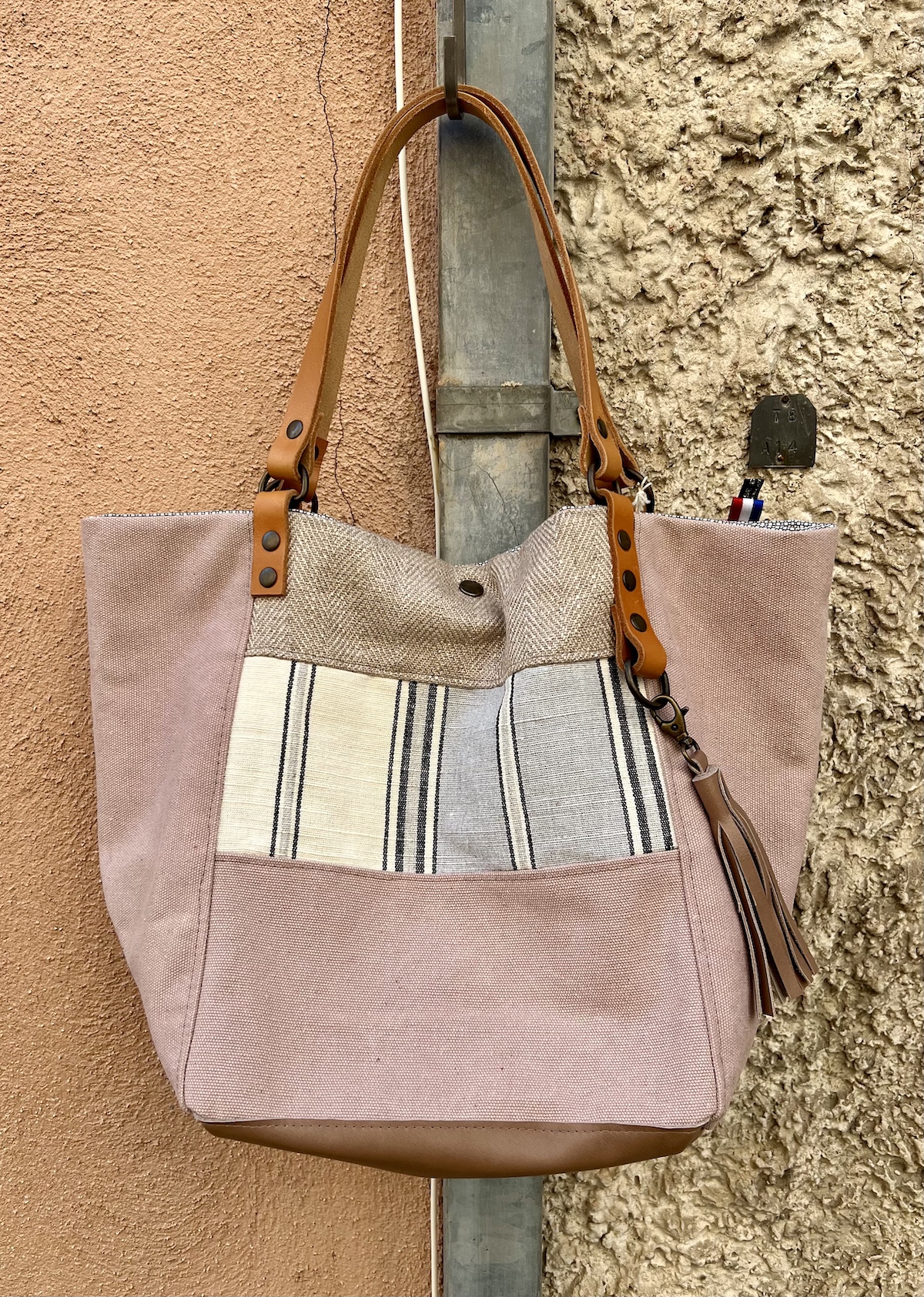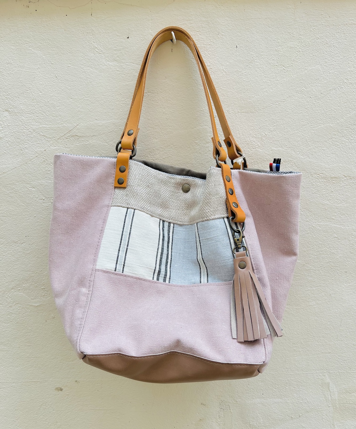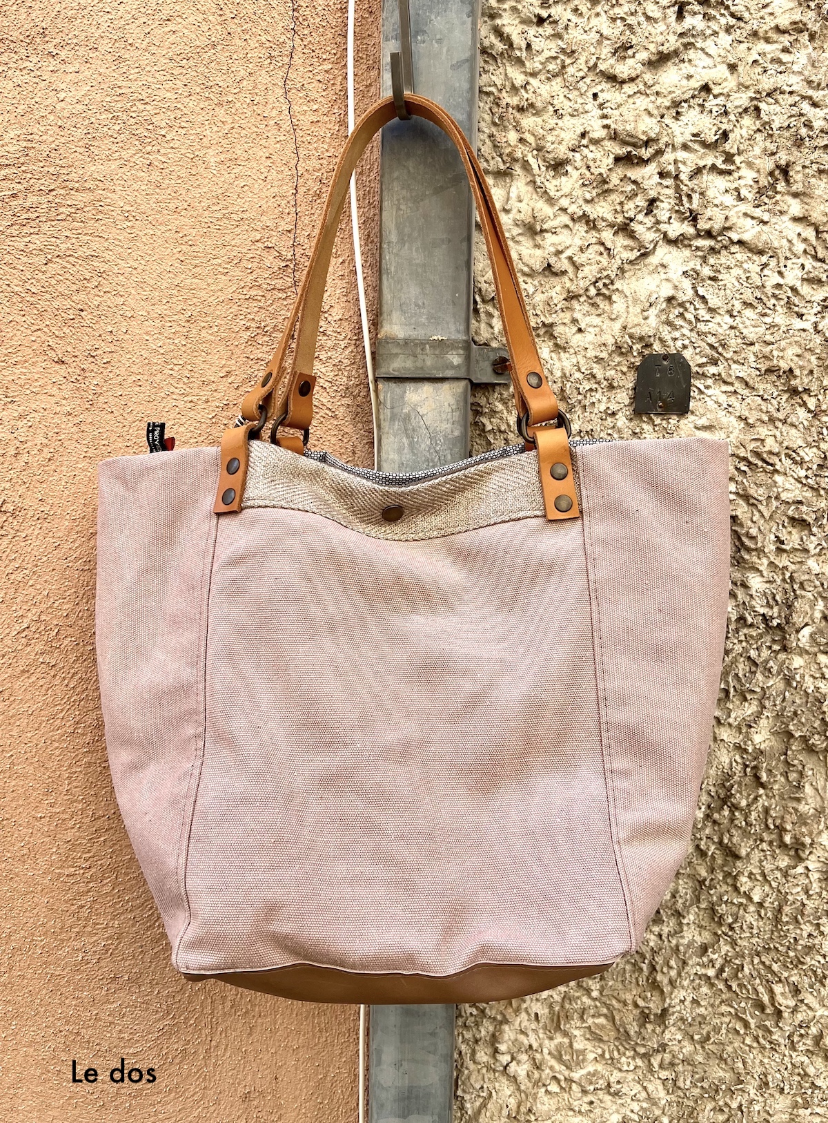 Sac cabas réversible, une pièce unique au charme bohème chic, confectionnée à la main dans notre atelier en Provence. Ce petit cabas réversible est réalisé à partir de toile de coton rose et cuir beige au fond du sac.