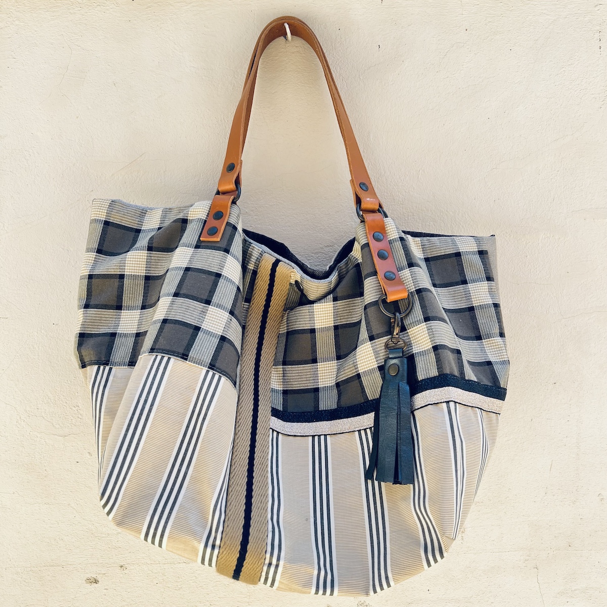 Sac cabas réversible en mix graphique de noir et beige en tissus anciens recyclé à la folie.