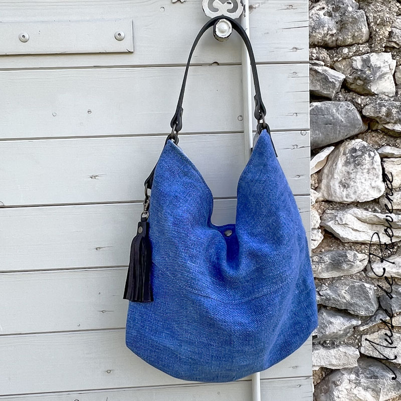 EXTERIEUR – en tissu ancien mélange du chanvre et du lin teinté bleu indigo et avec pompon en cuir (amovible) – fermé avec zip