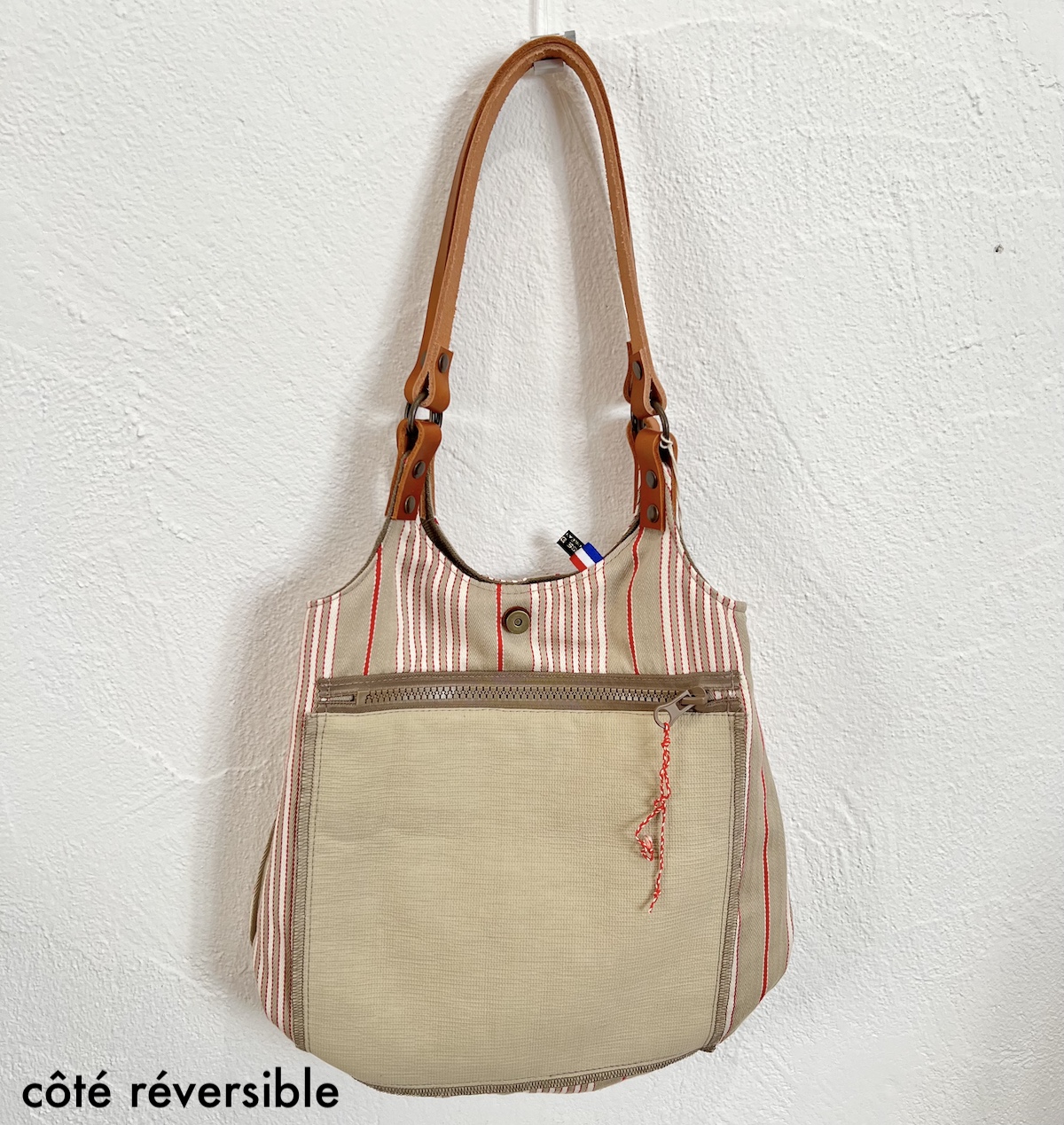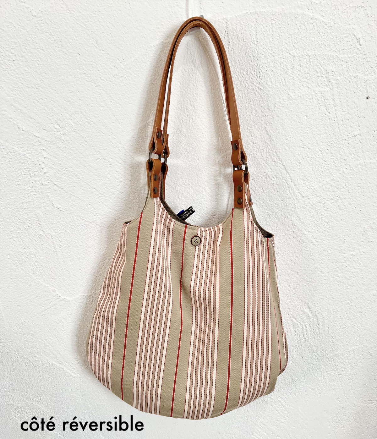 INTERIEUR et côté réversible – en tissu coton rayé beige, brun, rouge avec 1 grande poche fermée par fermeture éclair