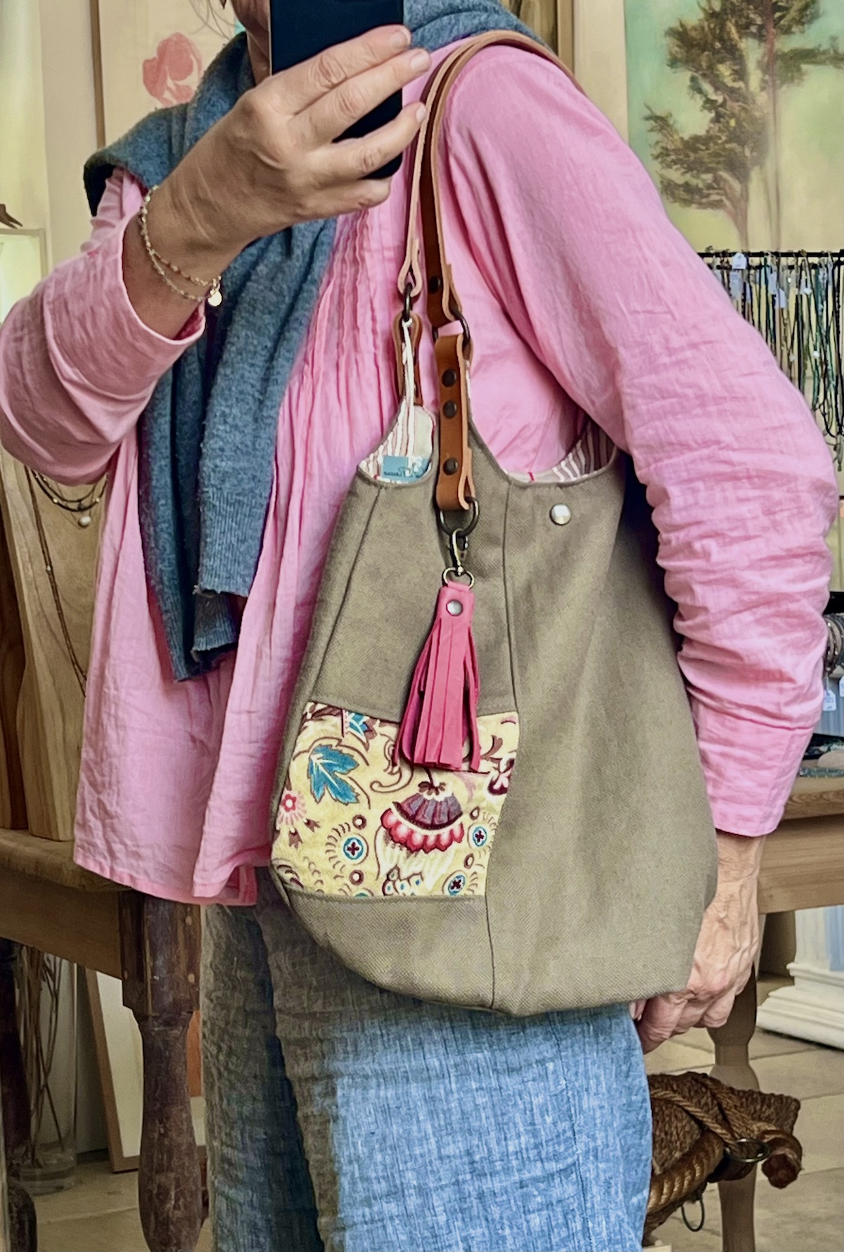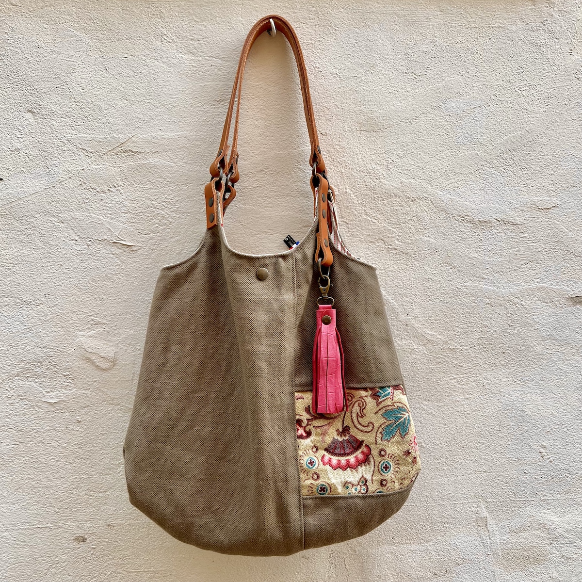 Sandra est un sac à main bohème chic, parfait mélange de chic et de décontraction. En toile de lin beige tissé en France, avec un petit détail patchwork en tissu ancien de 19e siècle. Sac cabas pratique et sympa, avec pompon cuir rose et une grande poche fermé par zip à l’intérieur pour sécuriser l’essentiel. Anses en cuir pour porter à l’épaule ou à la main.