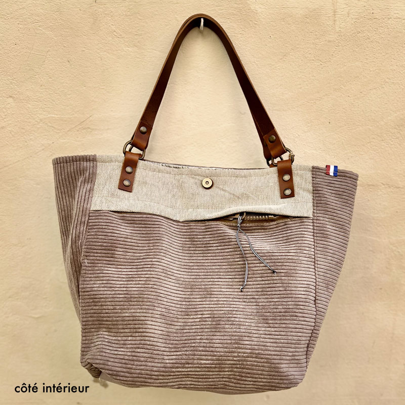 INTERIOR – and reversible side made of taupe corduroy canvas with 1 large pocket closed by zipper and semi-rigid bottom