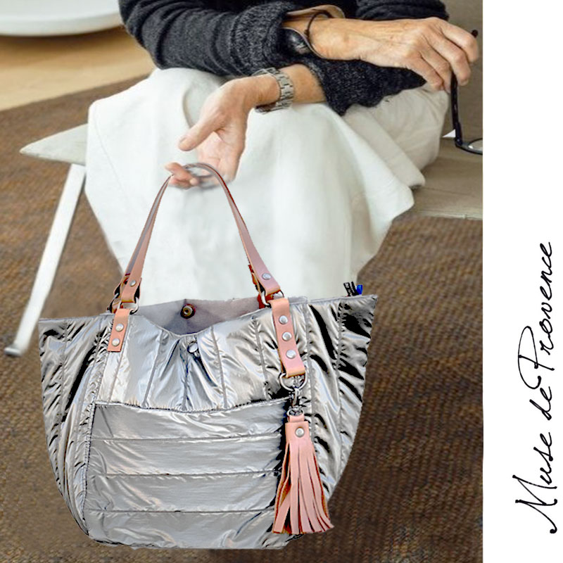 This unique quilted and metallic tote bag will captivate you… With its platinum-colored metallic fabric exterior (a blend of silver and gold) and reversible design, it reveals a taupe corduroy and cotton canvas interior for an elegant contrast with a superb texture. Its vegetable-tanned leather handles, matching tassel, and interior zip pocket make it an ultra-lightweight companion that is both practical and refined, perfect for carrying by hand or over the shoulder.