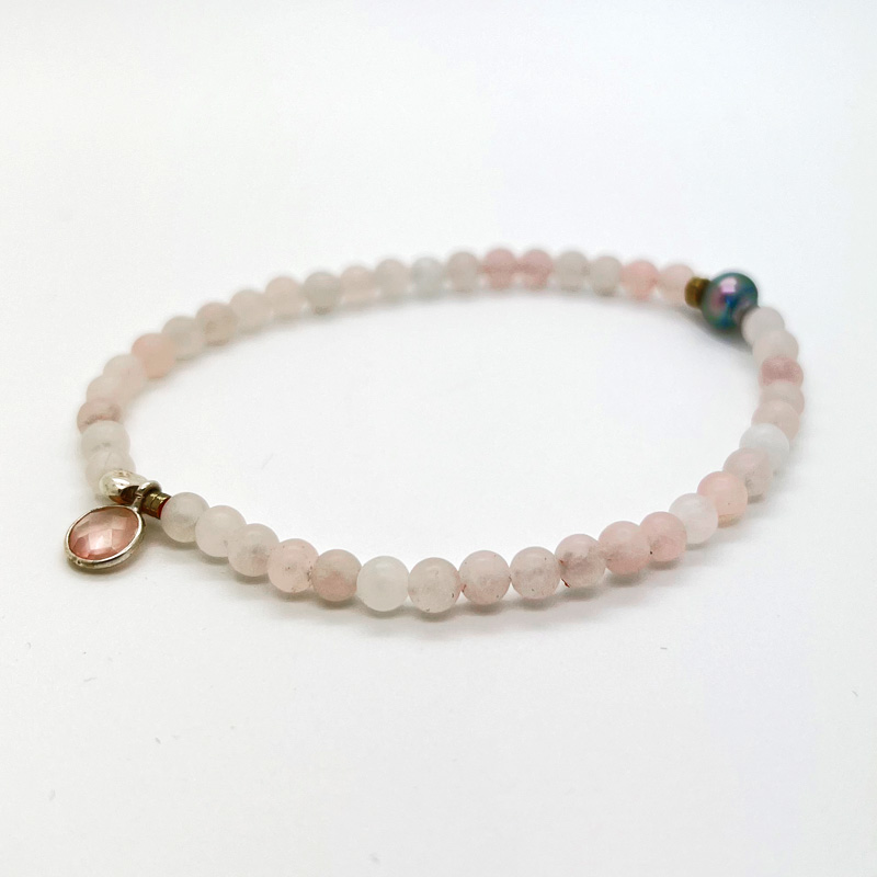 Bracelet en perles matte de pierre quartz rose mat avec pépite d’argent 925 + pendentif quartz rose serti en argent 925 et perle noire d’eau douce.