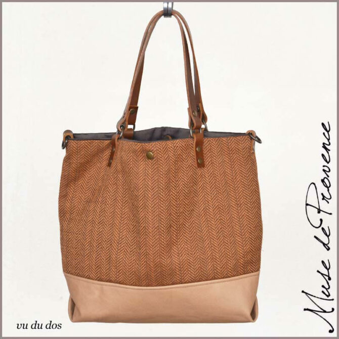 Sac cabas bandoulière en toile de lin chevronné brun caramel et cuir vachette beige avec anse bandoulière amovible en cuir..
