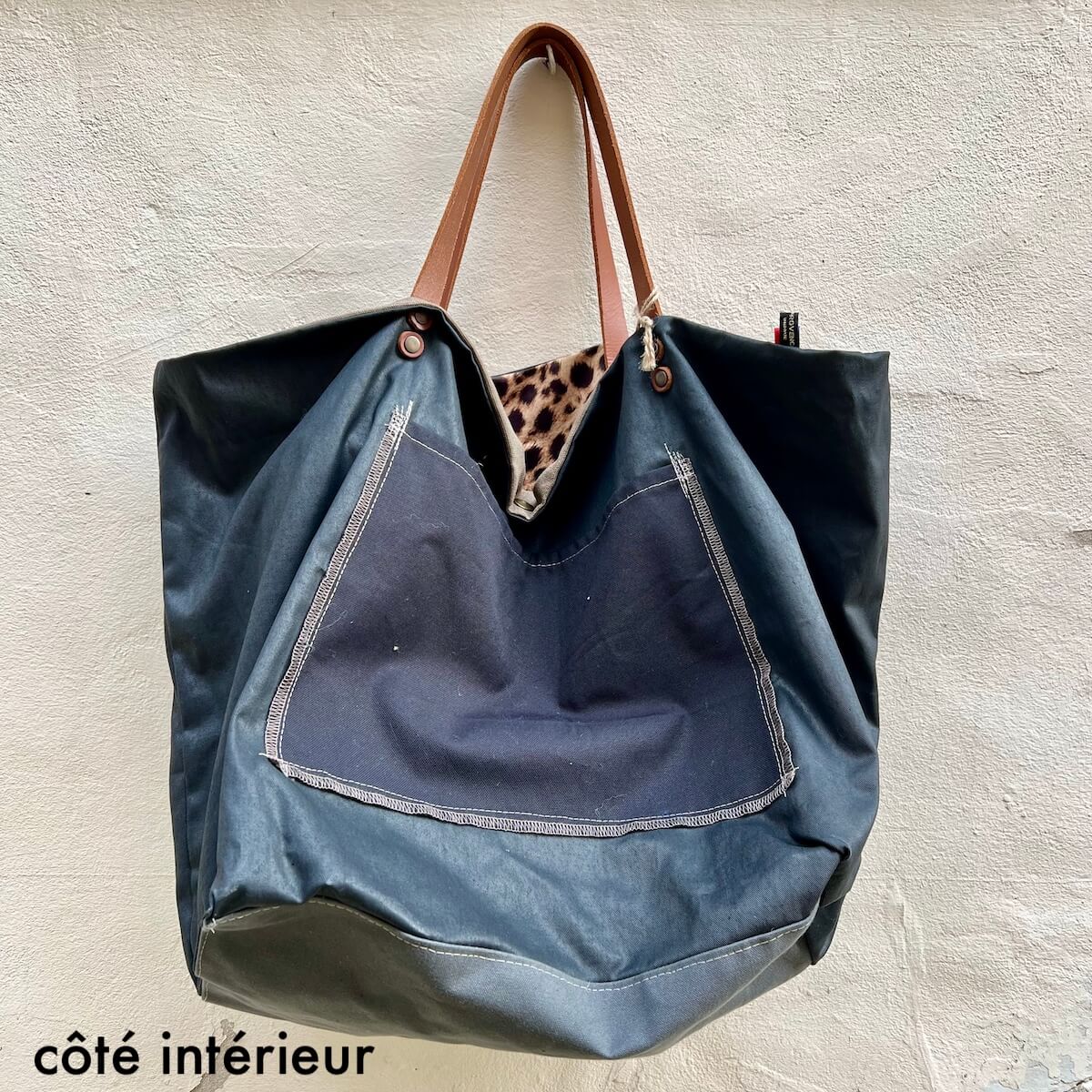 INTERIEUR – et côté réversible en toile de coton noire enduite avec 2 grandes poches et fond gris semi-rigide