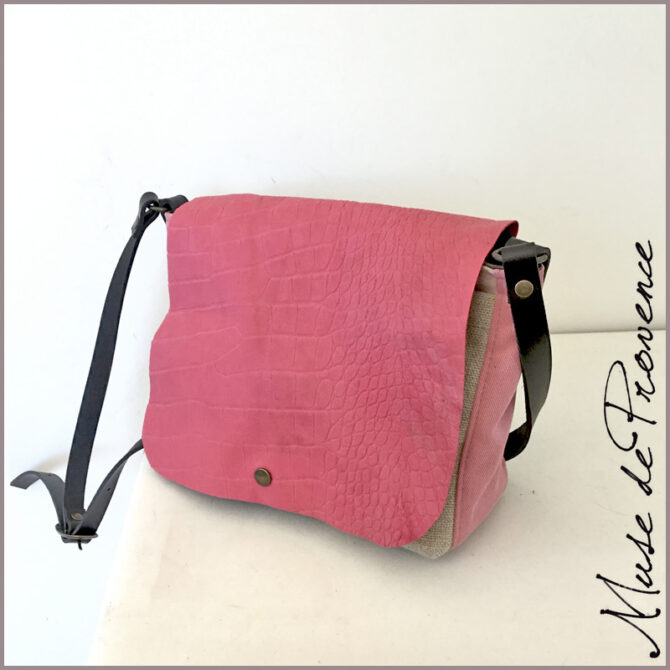 Extérieur: en toile de coton rose et lin naturel avec poche arrière & double poche devant, avec le rabat en cuir couleur rose