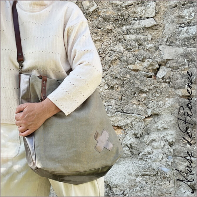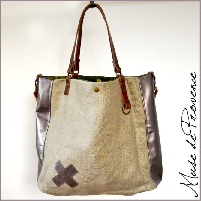 Sac cabas unique en lin et cuir. Association de toile beige taupe et cuir métallisé bronze. Sac minimaliste d’un format pratique. Intérieur doublé en toile avec une grande poche. Fermeture par bouton aimantée. Anses en cuir pour porté main ou épaule. Anse bandoulière en cuir pour porter en version sac bandoulière. Taille M/L.
