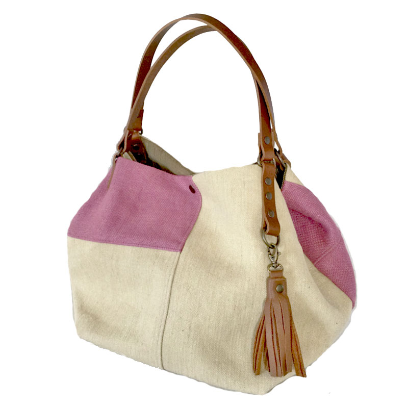 Cabas réversible en superbe chanvre chevronné vintage associé au lin rose..