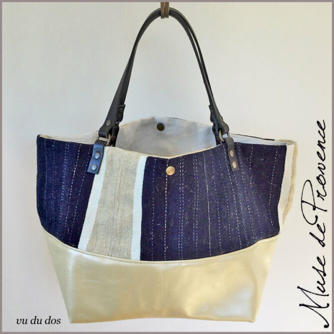 Sac cabas réversible en cuir métallisé nacre associé à une superbe toile ancienne aux fibres diverses..