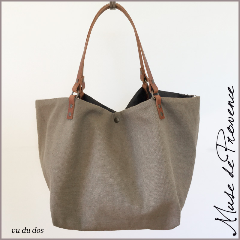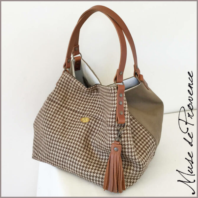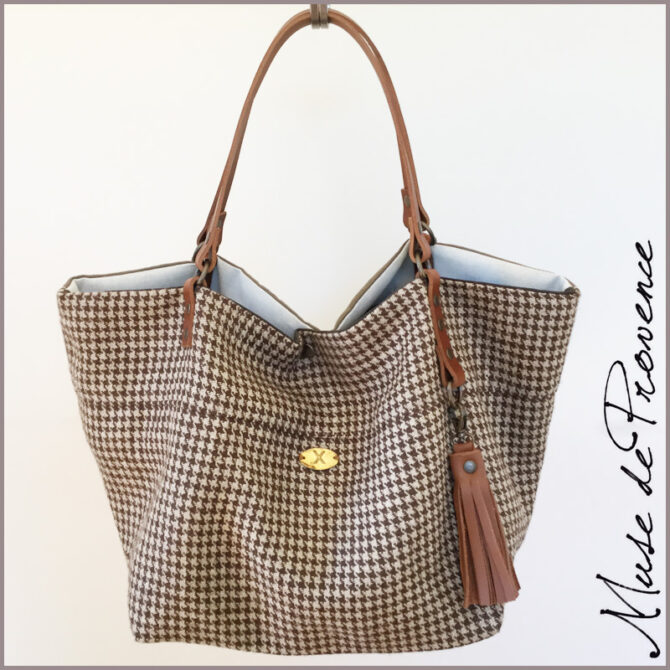 Sac cabas réversible en superbe lin pied-de-poule beige et pompon cuir et les anses en cuir..