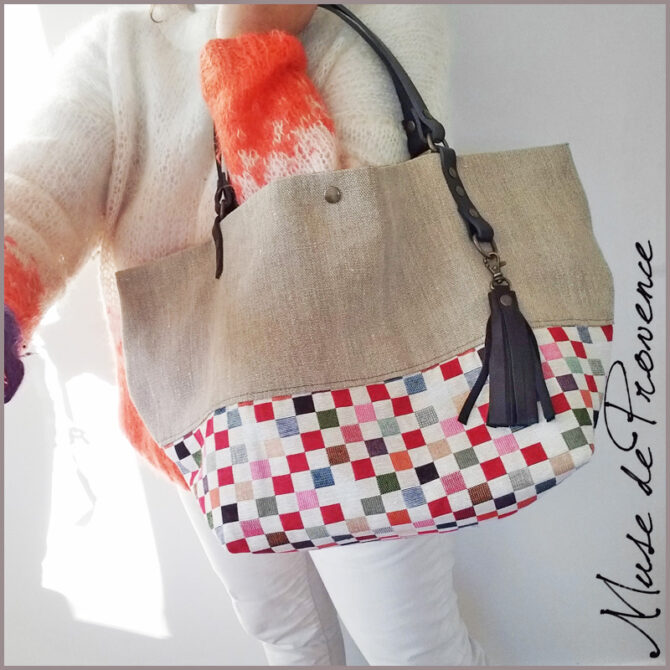 Sac cabas en lin naturel et le fond façon harlequin multicolore avec pompon cuir..