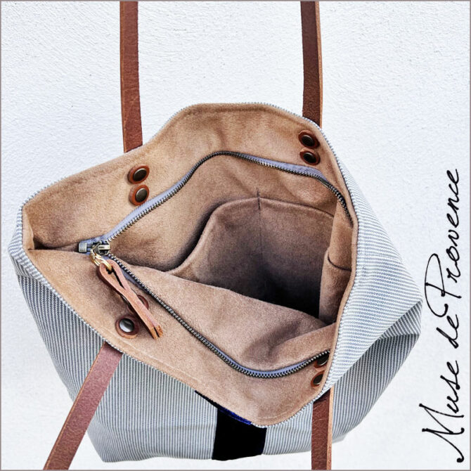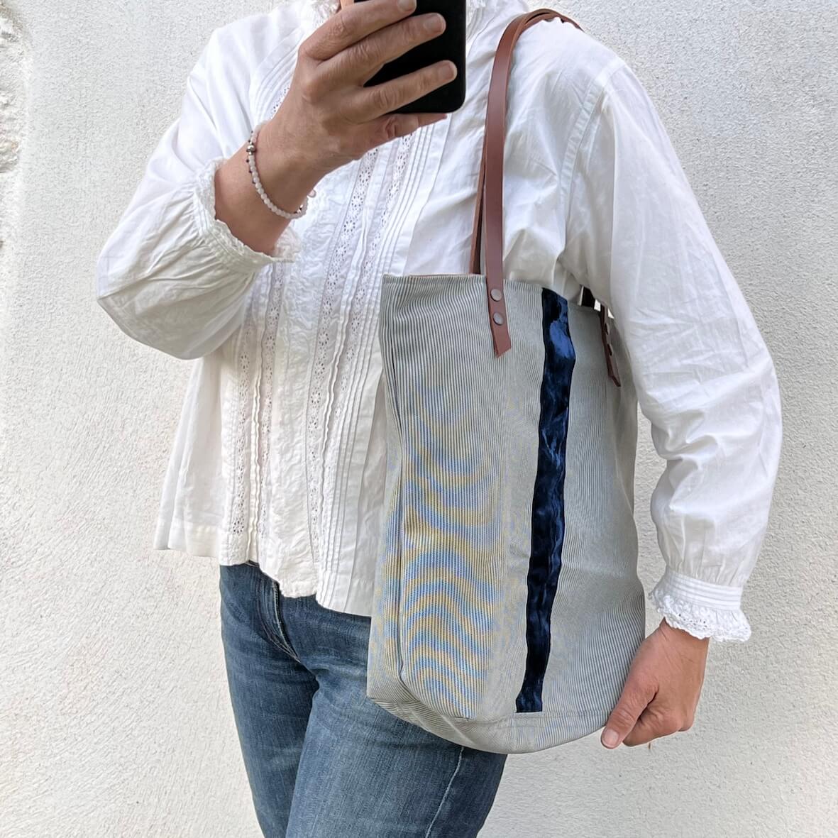 Allégresse, ce petit cabas chic est fabriqué avec un tissu à rayure chic gris, avec un galon vintage en soie de velours bleu profond (super joli !). Le tissu recyclé fait partie de la composition de ce petit cabas en modèle unique. Le sac cabas de taille S est parfait dans le quotidien permettant y porter tout le nécessaire en sécurité, un petit ordinateur ou tablette, paire de lunettes ou un petit pull…