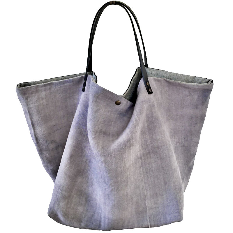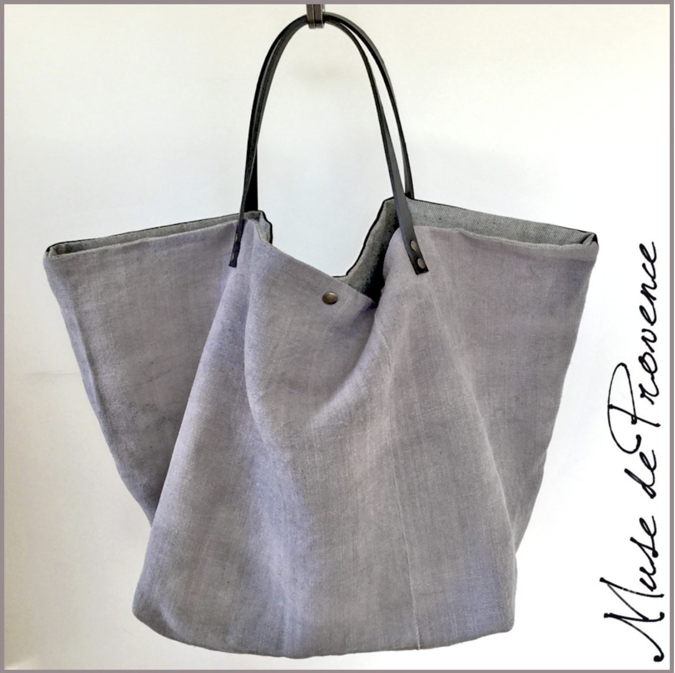 Maxi cabas XXL en chanvre & lin teinté gris, le dos noir, aux anses en cuir naturel..