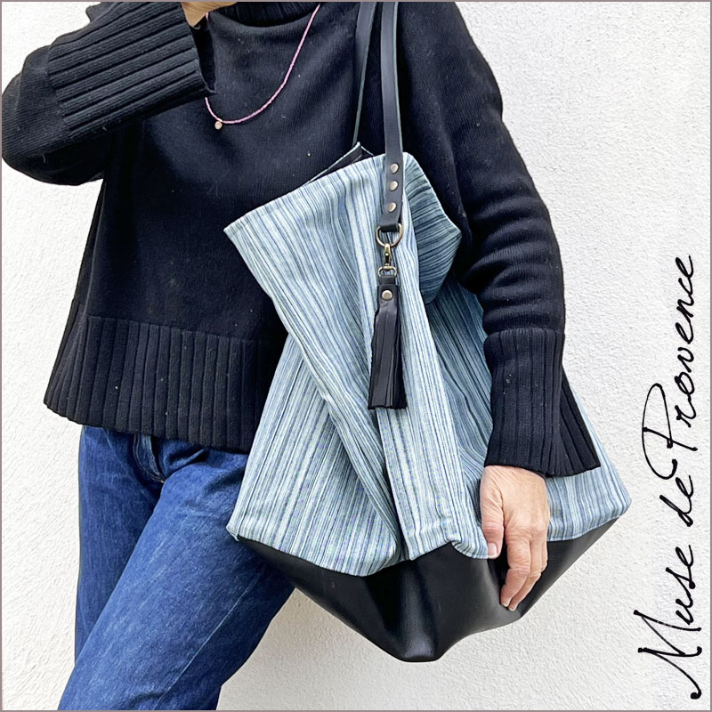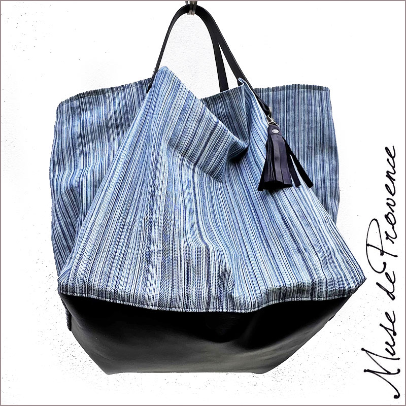 Sac cabas xxl luxueux en toile rayé bleu avec le fond et le pompon en cuir noir. Ce cabas xxl est également réversible avec intérieur en toile de coton satiné brun. 4 grandes poches pour tout ranger. Fermeture par bouton aimantée. Porté épaule ou à la main. Les anses sont en cuir noir au tannage végétal. Taille xxl.