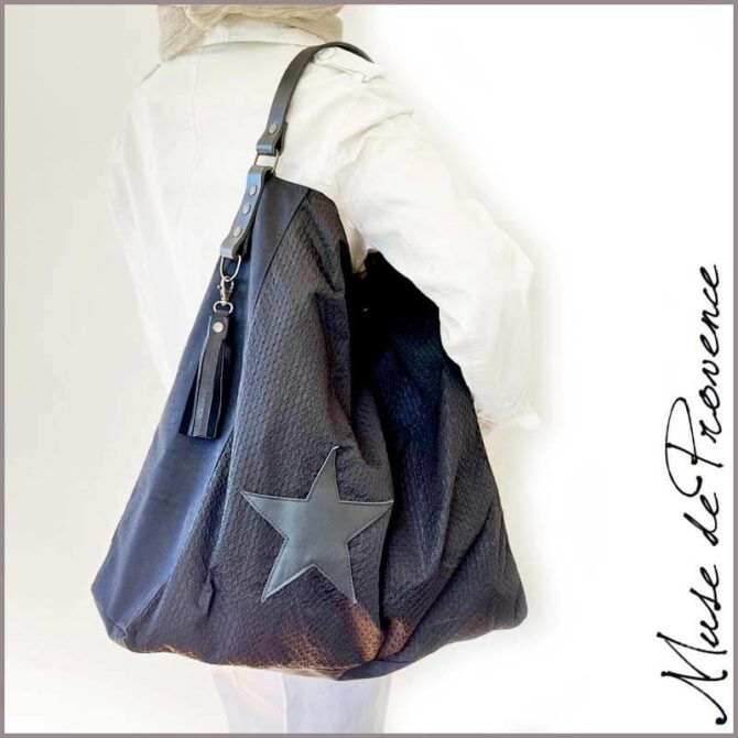 Grand sac noir en tissu à effet matière et texture avec pompon et étoile en cuir noir ..