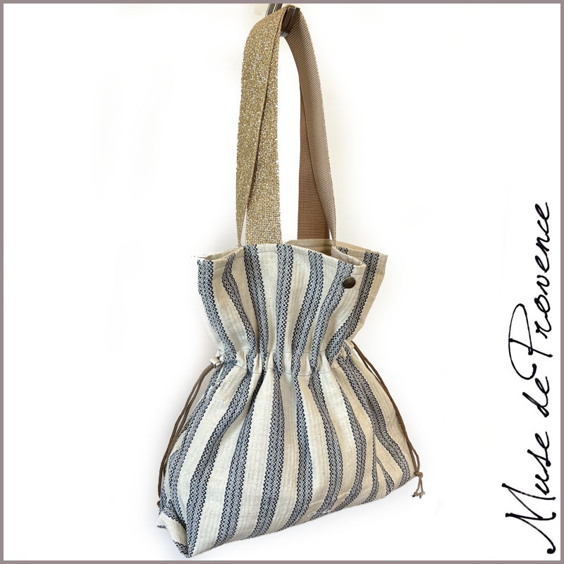 EXTERIEUR du sac totebag – en tissu ancien recyclé écru et bleu avec des petits détails du passé qui donnent du cachet/ fermeture par cordon et bouton aimanté / lavage délicat à 30° sans essorage