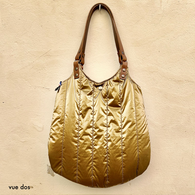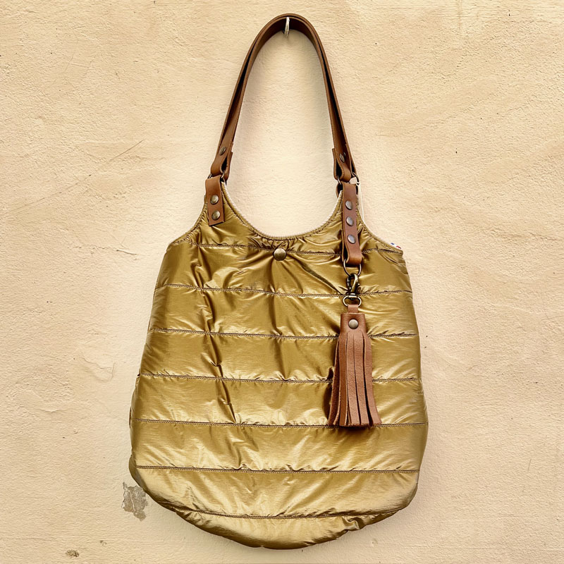 EXTERIOR: gold quilted canvas with brown leather pompom (removable)