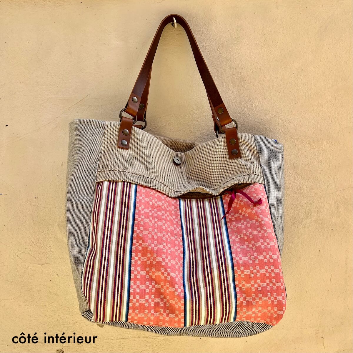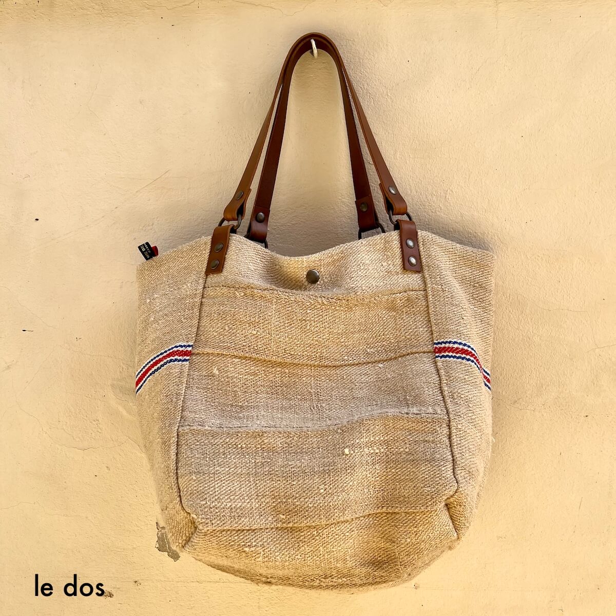 EXTERIOR – made from recycled hemp and linen (old grain sack) with removable leather pompom